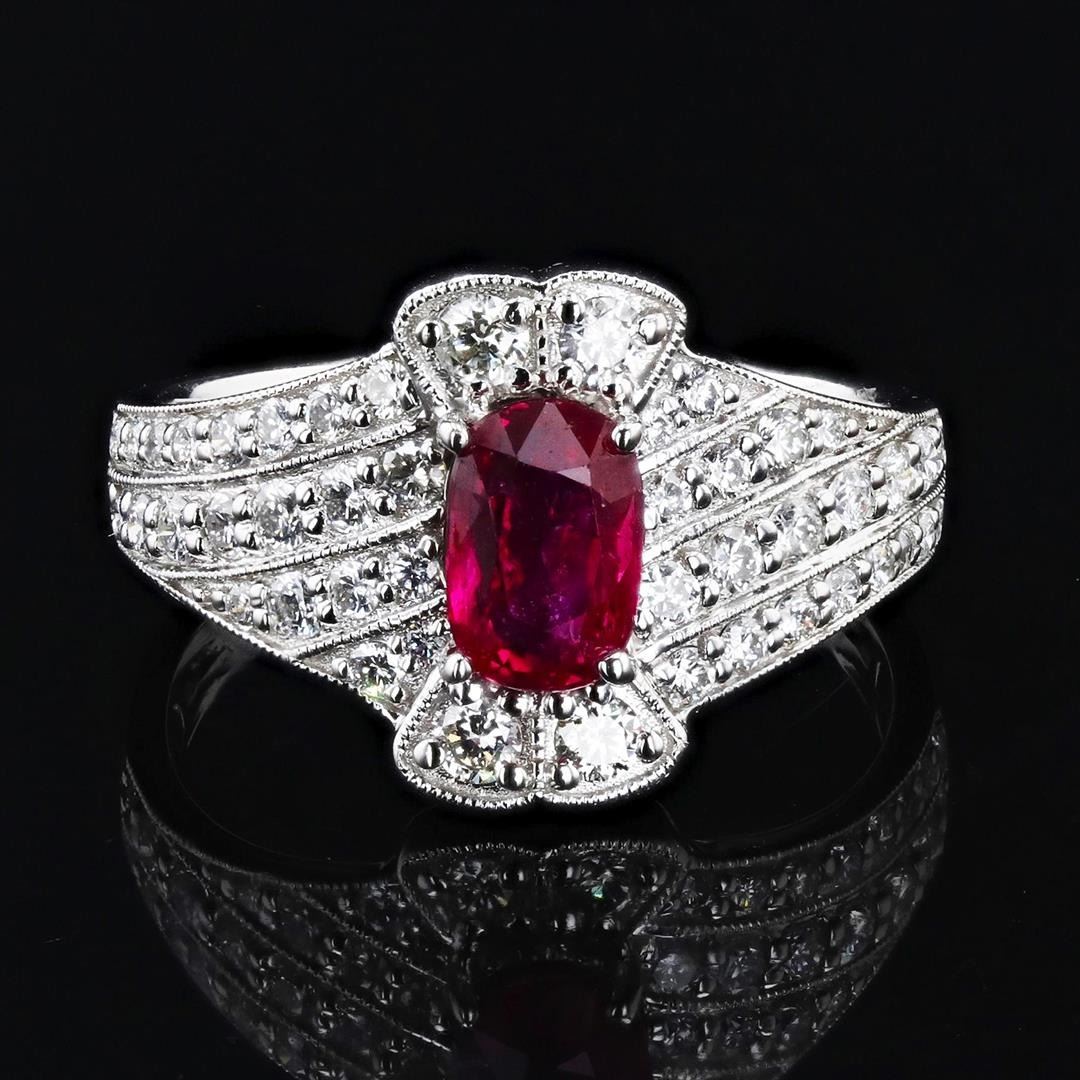 1.02ct UNHEATED Ruby and 0.79ctw Diamond 18K White Gold Ring (GIA CERTIFIED). Eighteen karat (18K) white gold natural ruby corundum and diamond ring. An oval cut natural ruby corundum gemstone is mounted in the center of the ring. Round brilliant cut diamonds accent the ring around and on both sides of the center gemstone. The ring has a gross weight of 4.4 Grams. Reference: GIA Ruby Report 02225130909 NATURAL GEMSTONE GEMSTONE: Ruby Corundum NATURE: Natural SHAPE: 0val Brilliant, Faceted Cut WEIGHT: 1.02 carat total DIMENSIONS: 6.84 x 4.78 x 3.15mm CLARITY: Type 2 COLOR: Red (5/5) SYMMETRY: .Excellent COLOR INTENSITY: Intense TRANSPARENCY: Transparent TONE: Dark NATURAL DIAMOND SHAPE: Round Brilliant Cut WEIGHT: 0.79 carat total (46pcs.) DIMENSIONS: 2.3 x 1.0mm AVERAGE CLARITY: VS2 to SI1 AVERAGE COLOR: F - G SYMMETRY: Excellent POLISH: Excellent METAL METAL: Gold PURITY: 18K (750) COLOR: White CONDITION: Excellent FINISH: High Polish