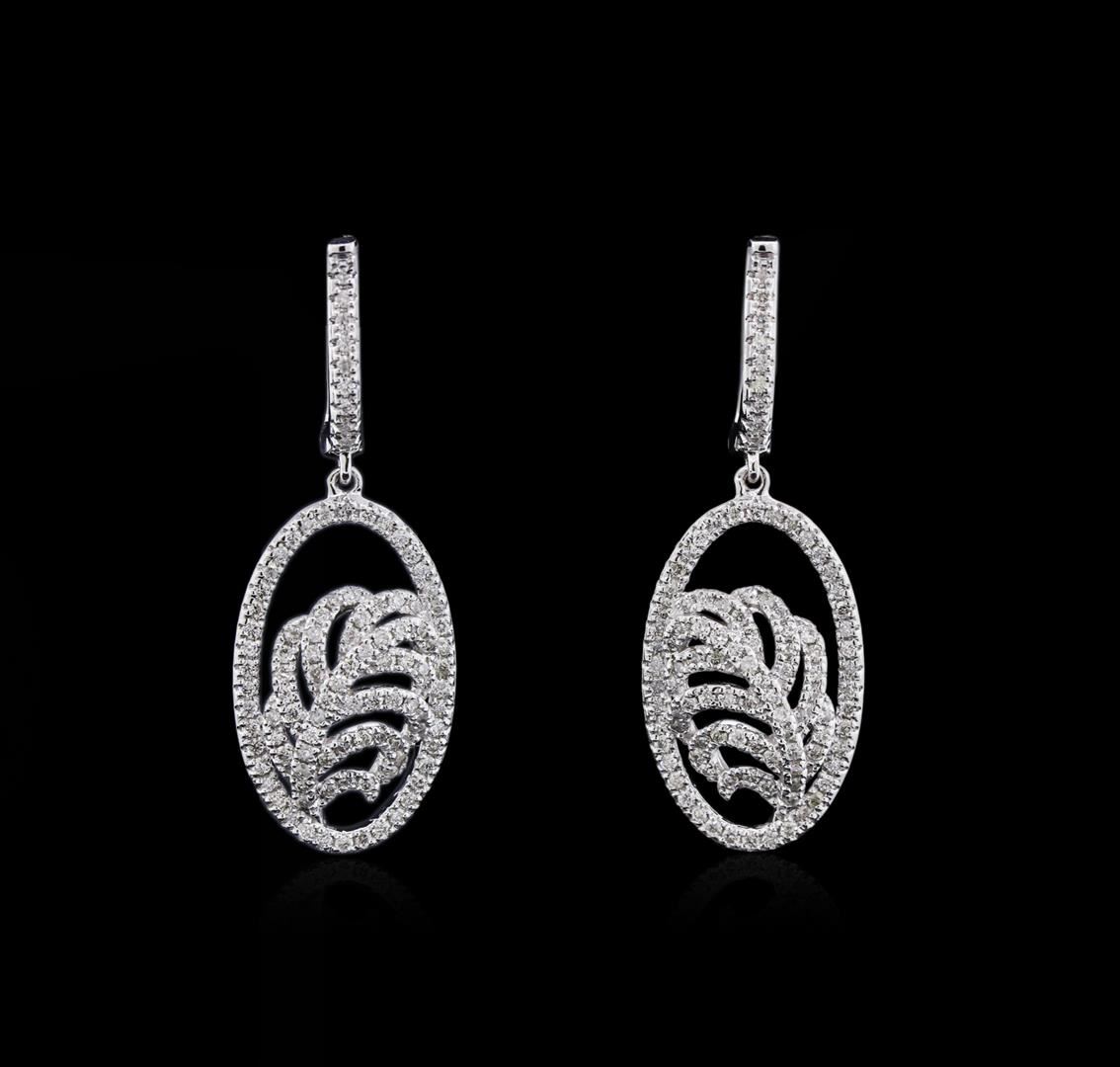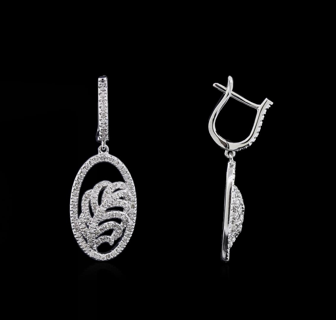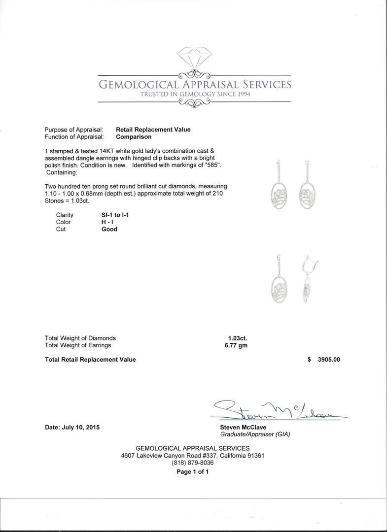 One stamped & tested 14KT white gold lady's combination cast & assembled dangle earrings with hinged clip backs with a bright polish finish. Condition is new. Identified with markings of "585". Containing: Two hundred ten prong set round brilliant cut diamonds, measuring 1.10 - 1.00 x 0.68mm (depth est.) approximate total weight of 210 Stones = 1.03ct. Clarity: SI-1 to I-1. Color: H - I. Cut: Good. Total Weight of Diamonds: 1.03ct. Total Weight of Earrings: 6.77 gm. GAS Appraised at $3,905.00.