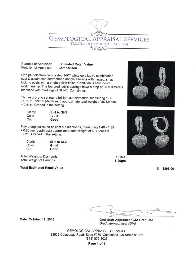 One pair electronically tested 14KT white gold lady's combination cast & assembled heart shape dangle earrings with hinged, snap locking posts with a bright polish finish. The featured lady's earrings have a drop of 25 millimeters. Identified with markings of 'K14'. Condition is new, good workmanship. Containing: Thirty-Six prong set round brilliant cut diamonds, measuring 1.60 - 1.50 x 0.96mm (depth est.) approximate total weight of 36 Stones = 0.51ct. Graded in the setting. Clarity SI-1 to SI-3. Color: G - H Cut Good Fifty prong set round brilliant cut diamonds, measuring 1.40 - 1.35 x 0.86mm (depth est.) approximate total weight of 50 Stones = 0.52ct. Graded in the setting. Clarity SI-1 to SI-2. Color: G - H Cut Good. Total Weight of Diamonds 1.03ct.. Total Weight of Earrings 5.20gm. GAS Appraised.