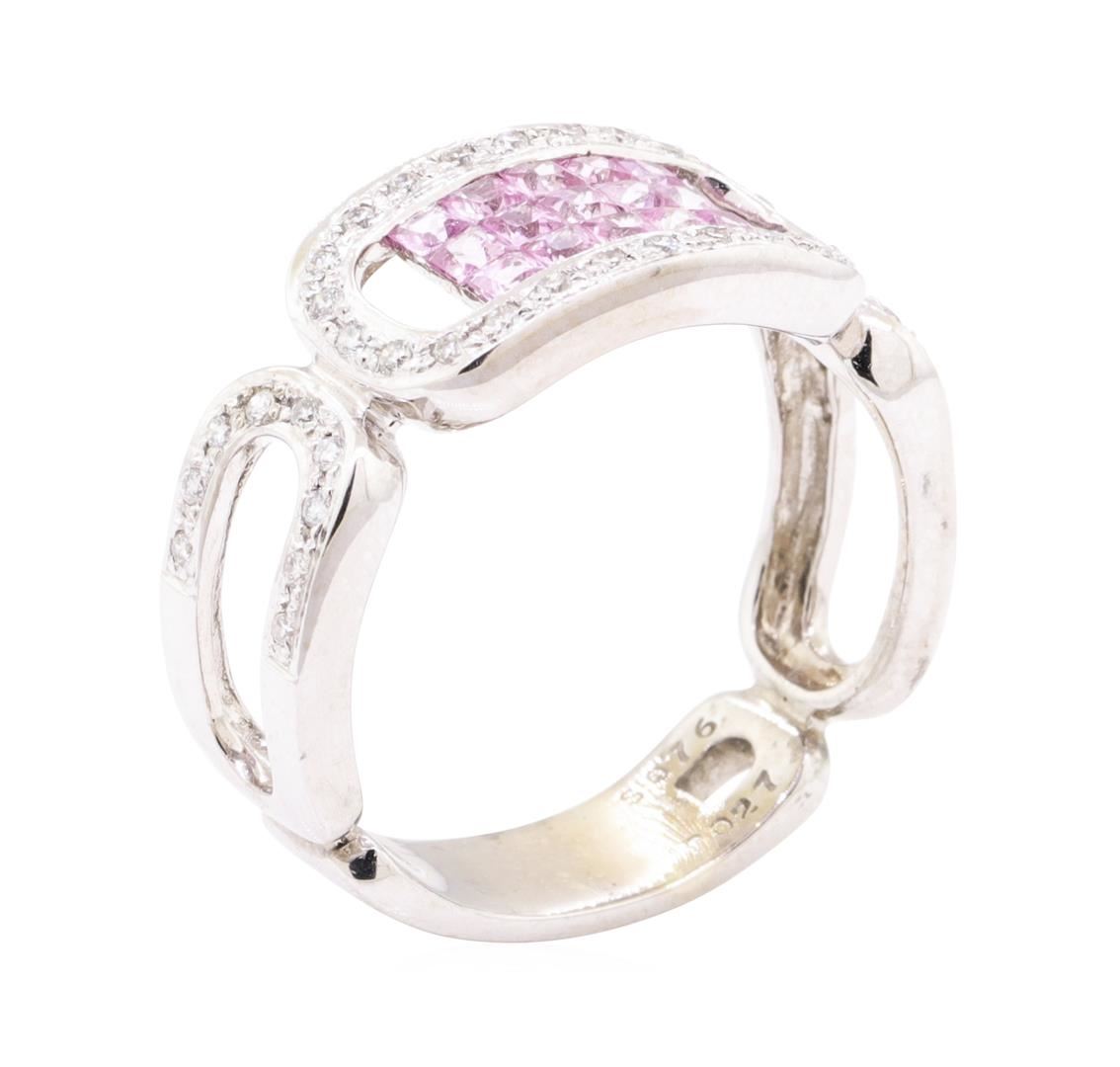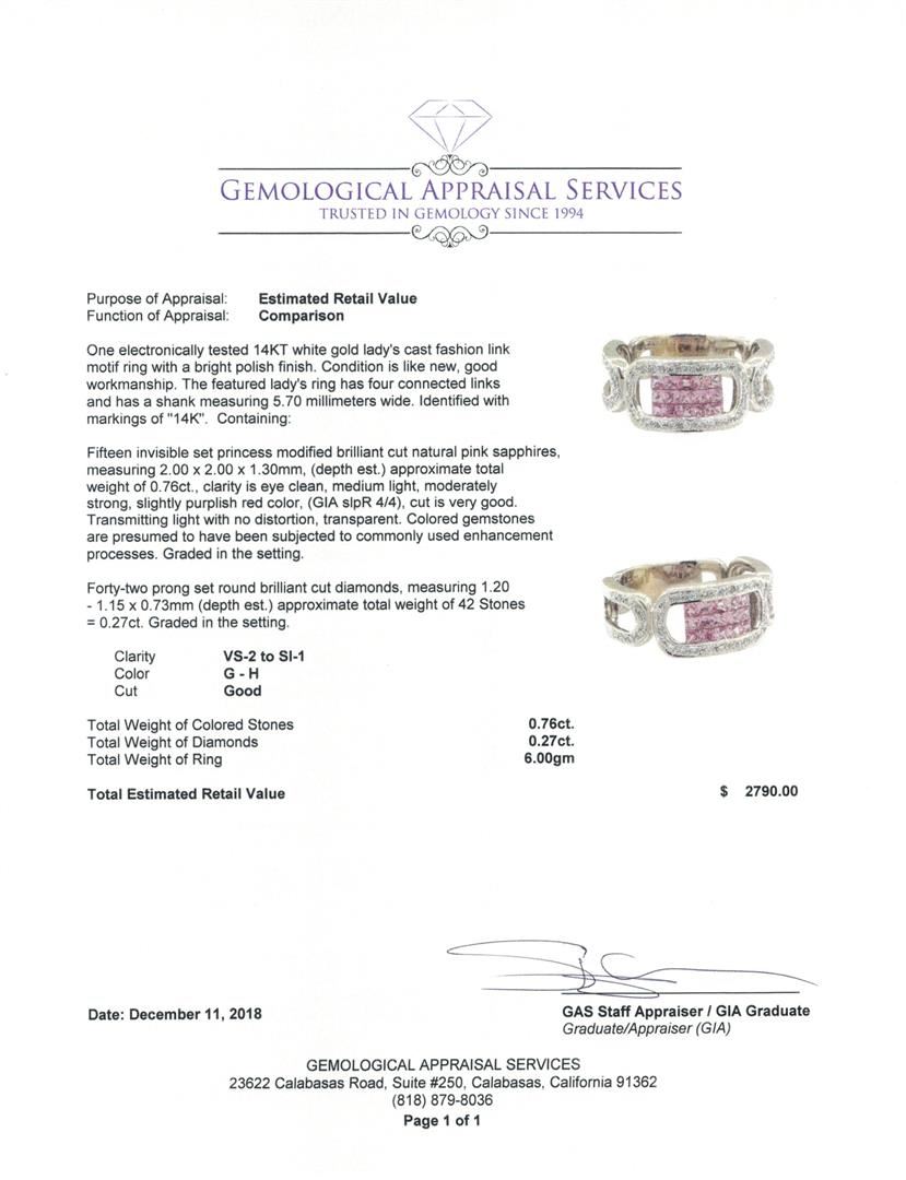 One electronically tested 14KT white gold lady's cast fashion link motif ring with a bright polish finish. The featured lady's ring has four connected links and has a shank measuring 5.70 millimeters wide. Identified with markings of '14K'. Condition is like new, good workmanship. Containing: Fifteen invisible set princess modified brilliant cut natural pink sapphires, measuring 2.00 x 2.00 x 1.30mm, (depth est.) approximate total weight of 0.76ct., clarity is eye clean, medium light, moderately strong, slightly purplish red color, (GIA slpR 4/4), cut is very good. Transmitting light with no distortion, transparent. Colored gemstones are presumed to have been subjected to commonly used enhancement processes. Graded in the setting. Forty-Two prong set round brilliant cut diamonds, measuring 1.20 - 1.15 x 0.73mm (depth est.) approximate total weight of 42 Stones = 0.27ct. Graded in the setting. Color G - H Clarity VS-2 to SI-1 Cut Good. Total Weight of Colored Stones 0.76ct.. Total Weight of Diamonds 0.27ct.. Total Weight of Ring 6.00gm GAS Appraised at $2790.00. GAS Appraised.