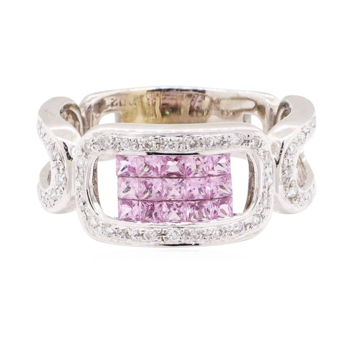One electronically tested 14KT white gold lady's cast fashion link motif ring with a bright polish finish. The featured lady's ring has four connected links and has a shank measuring 5.70 millimeters wide. Identified with markings of '14K'. Condition is like new, good workmanship. Containing: Fifteen invisible set princess modified brilliant cut natural pink sapphires, measuring 2.00 x 2.00 x 1.30mm, (depth est.) approximate total weight of 0.76ct., clarity is eye clean, medium light, moderately strong, slightly purplish red color, (GIA slpR 4/4), cut is very good. Transmitting light with no distortion, transparent. Colored gemstones are presumed to have been subjected to commonly used enhancement processes. Graded in the setting. Forty-Two prong set round brilliant cut diamonds, measuring 1.20 - 1.15 x 0.73mm (depth est.) approximate total weight of 42 Stones = 0.27ct. Graded in the setting. Color G - H Clarity VS-2 to SI-1 Cut Good. Total Weight of Colored Stones 0.76ct.. Total Weight of Diamonds 0.27ct.. Total Weight of Ring 6.00gm GAS Appraised at $2790.00. GAS Appraised.