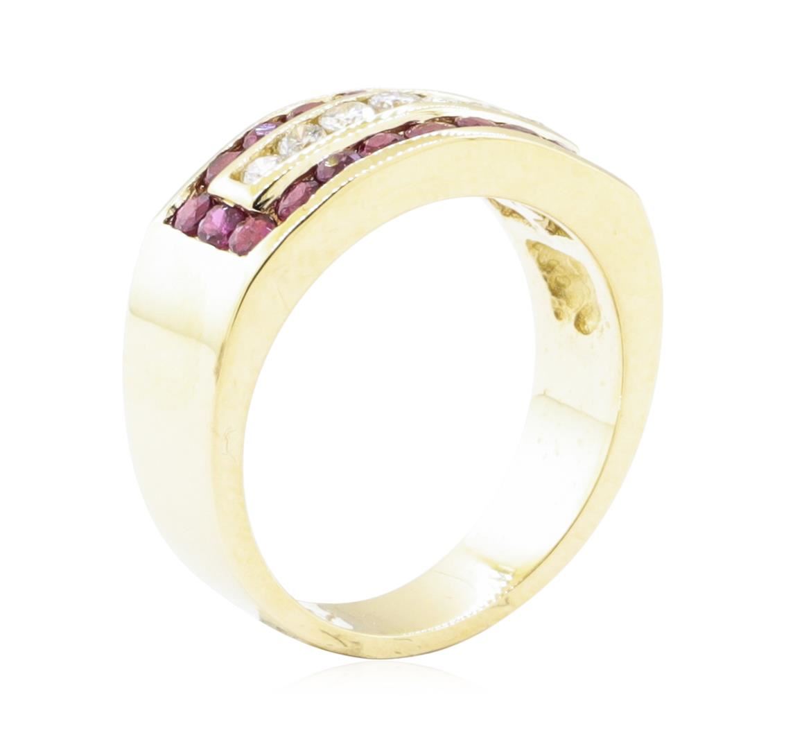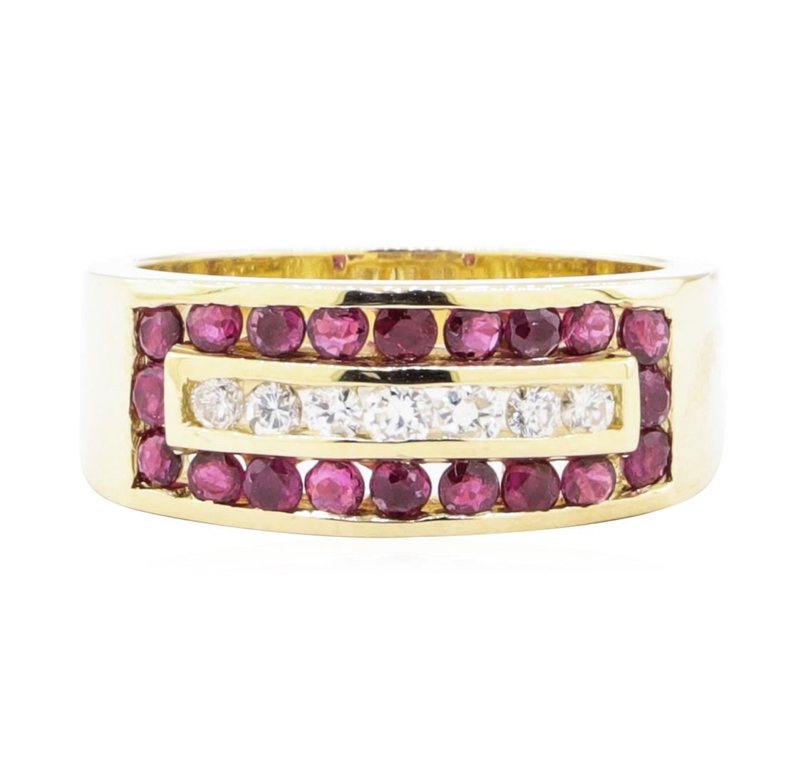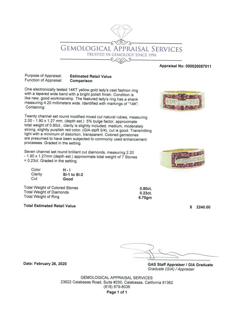 One electronically tested 14KT yellow gold lady's cast fashion ring with a tapered wide band with a bright polish finish. The featured lady's ring has a shank measuring 4.20 millimeters wide. Identified with markings of '14K'. Condition is Good. Containing: Twenty channel set round modified mixed cut natural rubies, measuring 2.00 - 1.90 x 1.27 mm, (depth est.) 5%. bulge factor, approximate total weight of 0.80ct., clarity is slightly included, medium, moderately strong, slightly purplish red color, (GIA slpR 5/4), cut is good. Transmitting light with a minimum of distortion, transparent. Colored gemstones are presumed to have been subjected to commonly used enhancement processes. Graded in the setting. Seven channel set round brilliant cut diamonds, measuring 2.20 - 1.90 x 1.27mm (depth est.) approximate total weight of 7 Stones = 0.23ct. Graded in the setting. Color H - I Clarity SI-1 to SI-2 Cut Good. Total Weight of Colored Stones 0.80ct.. Total Weight of Diamonds 0.23ct.. Total Weight of Ring 6.70gm GAS Appraised at $2240.00. GAS Appraised.
