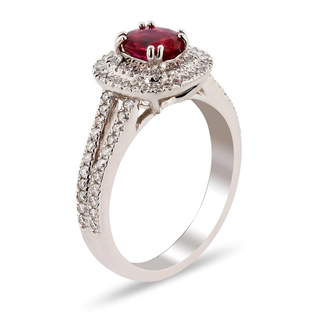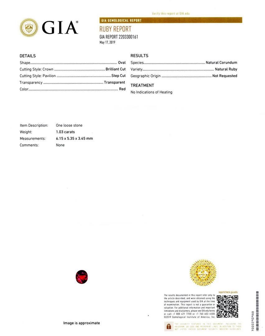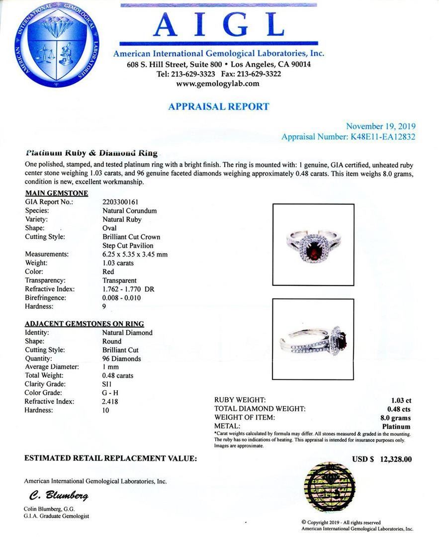 1.03ct UNHEATED Ruby and 0.48ctw Diamond Platinum Ring (GIA CERTIFIED). Platinum Ruby & Diamond Ring One polished, stamped, and tested platinum ring with a bright finish. The ring is mounted with: 1 genuine, GIA certified, unheated ruby center stone weighing 1.03 carats, and 96 genuine faceted diamonds weighing approximately 0.48 carats. This item weighs 8.0 grams, condition is new, excellent workmanship. MAIN GEMSTONE GIA Report No.: 2203300161 Species: Natural Corundum Variety: Natural Ruby Shape: Oval Cutting Style: Brilliant Cut Crown Step Cut Pavilion Measurements: 6.25 x 5.35 x 3.45mm Weight: 1.03 carats Color: Red Transparency: Transparent Refractive Index: 1.762 - 1.770 DR Birefringence: 0.008 - 0.010 Hardness: 9 ADJACENT GEMSTONES ON RING Identity: Natural Diamond Shape: Round Cutting Style: Brilliant Cut Quantity: 96 Diamonds Average Diameter: 1 mm Total Weight: 0.48 carats Clarity Grade: SI1 Color Grade: G - H Refractive Index: 2.418 Hardness: 10 RUBY WEIGHT: 1.03ct TOTAL DIAMOND WEIGHT: 0.48ctw WEIGHT OF ITEM: 8.0 grams METAL: Platinum