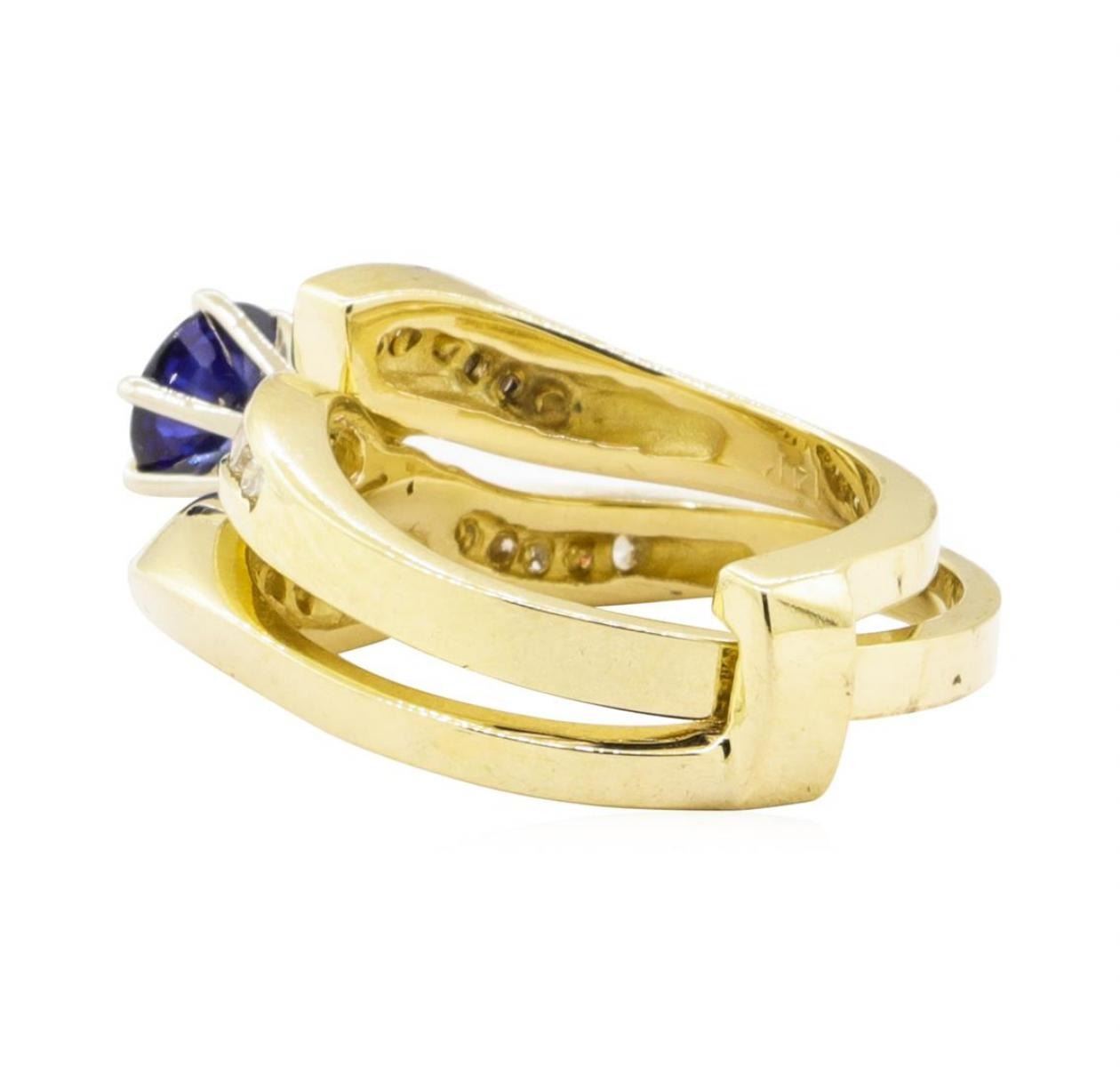 One set electronically tested 14KT yellow gold lady's combination cast & assembled fashion ring and band with a bypass insert motif with a bright polish finish. The featured lady's ring set has a double shank measuring 4.50 millimeters wide. Identified with markings of '14K'. Condition is new, good workmanship. Containing: One prong set round modified mixed cut natural blue sapphire, measuring 5.60 - 5.46 x 2.60 mm, (depth est.) approximate weight of 0.66ct., clarity is slightly included, medium dark, moderately strong, blue color, (GIA B 6/4), cut is good. Transmitting light with a minimum of distortion, transparent. Colored gemstones are presumed to have been subjected to commonly used enhancement processes. Graded in the setting. Eight channel set round brilliant cut diamonds, measuring 1.90 - 1.85 x 1.13mm (depth est.) approximate total weight of 8 Stones = 0.20ct. Graded in the setting. Color H - I Clarity VS-2 to SI-2 Cut Very Good Twelve channel set baguette cut diamonds, measuring from 1.60 x 1.00 x 0.85mm (depth est.) to 1.80 x 1.10 x 0.94mm (depth est.) approximate total weight of 12 Stones = 0.18ct. Graded in the setting. Color H - I Clarity VS-2 to SI-1 Cut Very Good. Total Weight of Colored Stones 0.66ct.. Total Weight of Diamonds 0.38ct.. Total Weight of Ring And Band 7.80gm GAS Appraised at $2945.00. GAS Appraised.