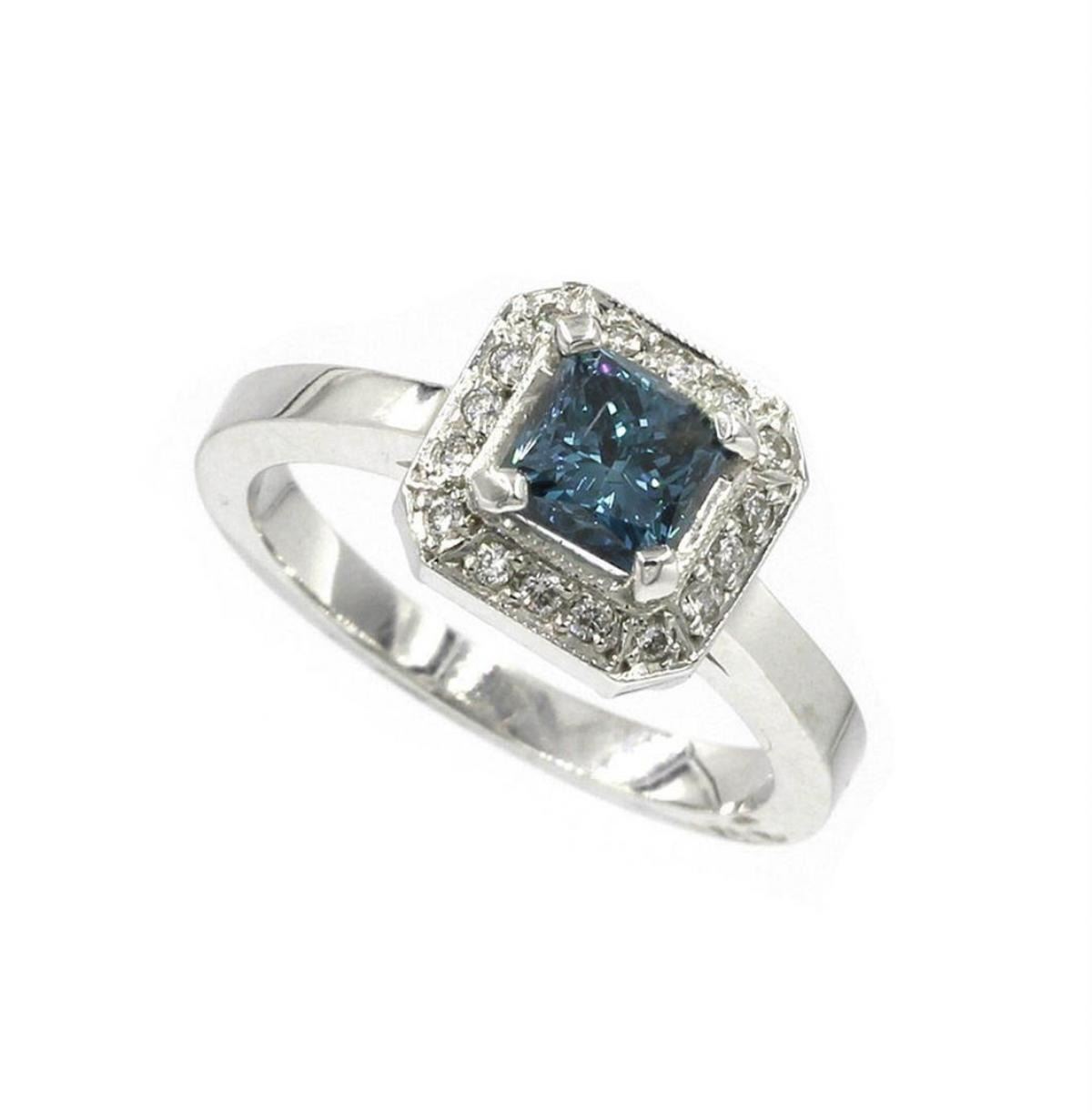 One lady's wedding ring featuring: 18KT white gold weighing 6.60 grams containing one center blue diamond weighing 1.04ct and 16 white diamonds weighing 0.17ctw. The blue diamond is color enhanced, princess cut with fine clarity and deep blue color with very good cut. The white diamonds are round brilliant cut and are natural, unenhanced stones with SI-1 clarity and G-H color. The ring is a size 6.25 but is resizable.