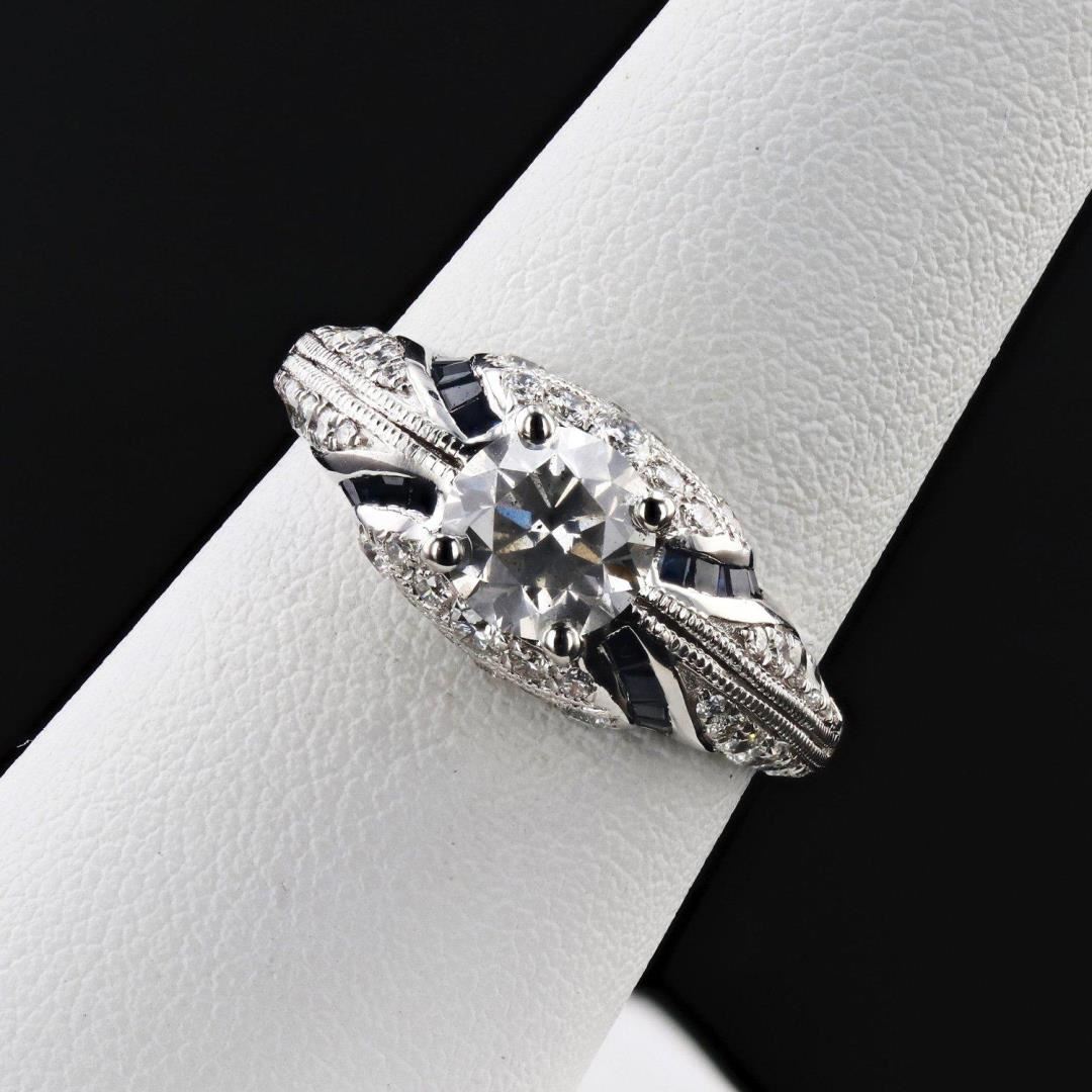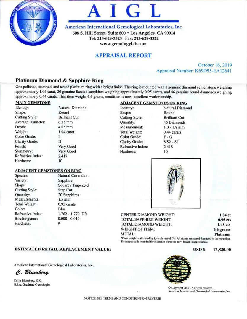 Platinum Diamond & Sapphire Ring One polished, stamped, and tested platinum ring with a bright finish. The ring is mounted with 1 genuine diamond center stone weighing approximately 1.04 carat, 20 genuine faceted sapphires weighing approximately 0.95 carats, and 46 genuine round diamonds weighing approximately 0.44 carats. This item weighs 6.6 grams, condition is new, excellent workmanship. *MAIN GEMSTONE* Identity: Natural Diamond Shape: Round Cutting Style: Brilliant Cut Average Diameter: 6.25mm Depth: 4.05mm Weight: 1.04 carat Color Grade: I Clarity Grade: I1 Polish: Very Good Symmetry: Very Good Refractive Index: 2.417 Hardness: 10 *ADJACENT GEMSTONES ON RING* Identity: Natural Diamond Shape: Round Cutting Style: Brilliant Cut Quantity: 46 Diamonds Measurement: 1.0 - 1.8mm Total Weight: 0.44 carats Color Grade: F - G Clarity Grade: VS2 - SI1 Refractive Index: 2.418 Hardness: 10 *ADJACENT GEMSTONES ON RING* Species: Natural Corundum Variety: Sapphire Shape: Square/Trapezoid Cutting Style: Step Cut Quantity: 20 Sapphires Measurements: 1.5mm Total Weight: 0.95 carats Color: Blue Refractive Index: 1.762 - 1770 DR Birefringence: 0.008 - 0.010 Hardness: 9 Size: 6.75