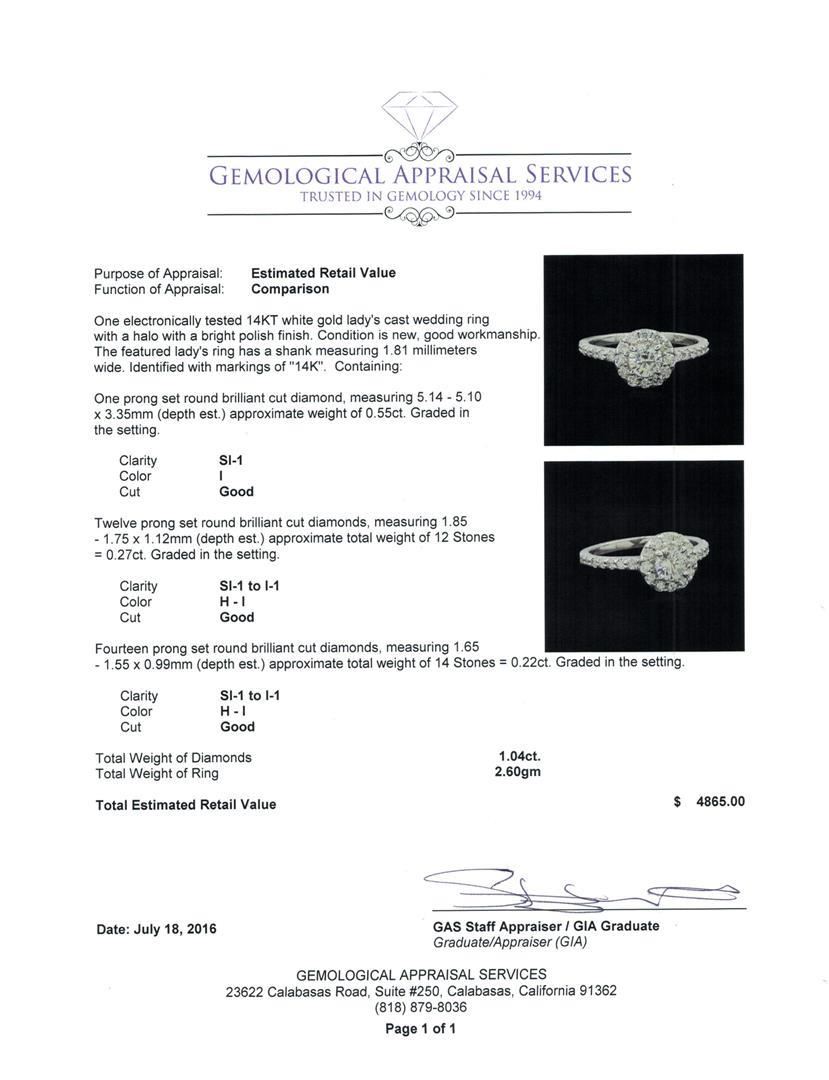 One electronically tested 14KT white gold lady's cast wedding ring with a halo with a bright polish finish. The featured lady's ring has a shank measuring 1.81 millimeters wide. Identified with markings of '14K'. Condition is new, good workmanship. Containing: One prong set round brilliant cut diamond, measuring 5.14 - 5.10 x 3.35mm (depth est.) approximate weight of 0.55ct. Graded in the setting. Clarity SI-1. Color: I Cut Good Twelve prong set round brilliant cut diamonds, measuring 1.85 - 1.75 x 1.12mm (depth est.) approximate total weight of 12 Stones = 0.27ct. Graded in the setting. Clarity SI-1 to I-1. Color: H - I Cut Good Fourteen prong set round brilliant cut diamonds, measuring 1.65 - 1.55 x 0.99mm (depth est.) approximate total weight of 14 Stones = 0.22ct. Graded in the setting. Clarity SI-1 to I-1. Color: H - I Cut Good. Total Weight of Diamonds 1.04ct.. Total Weight of Ring 2.60gm. GAS Appraised.
