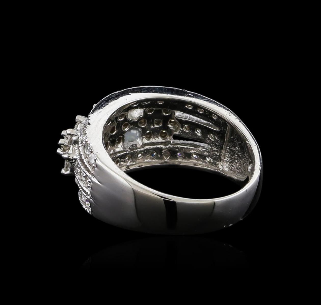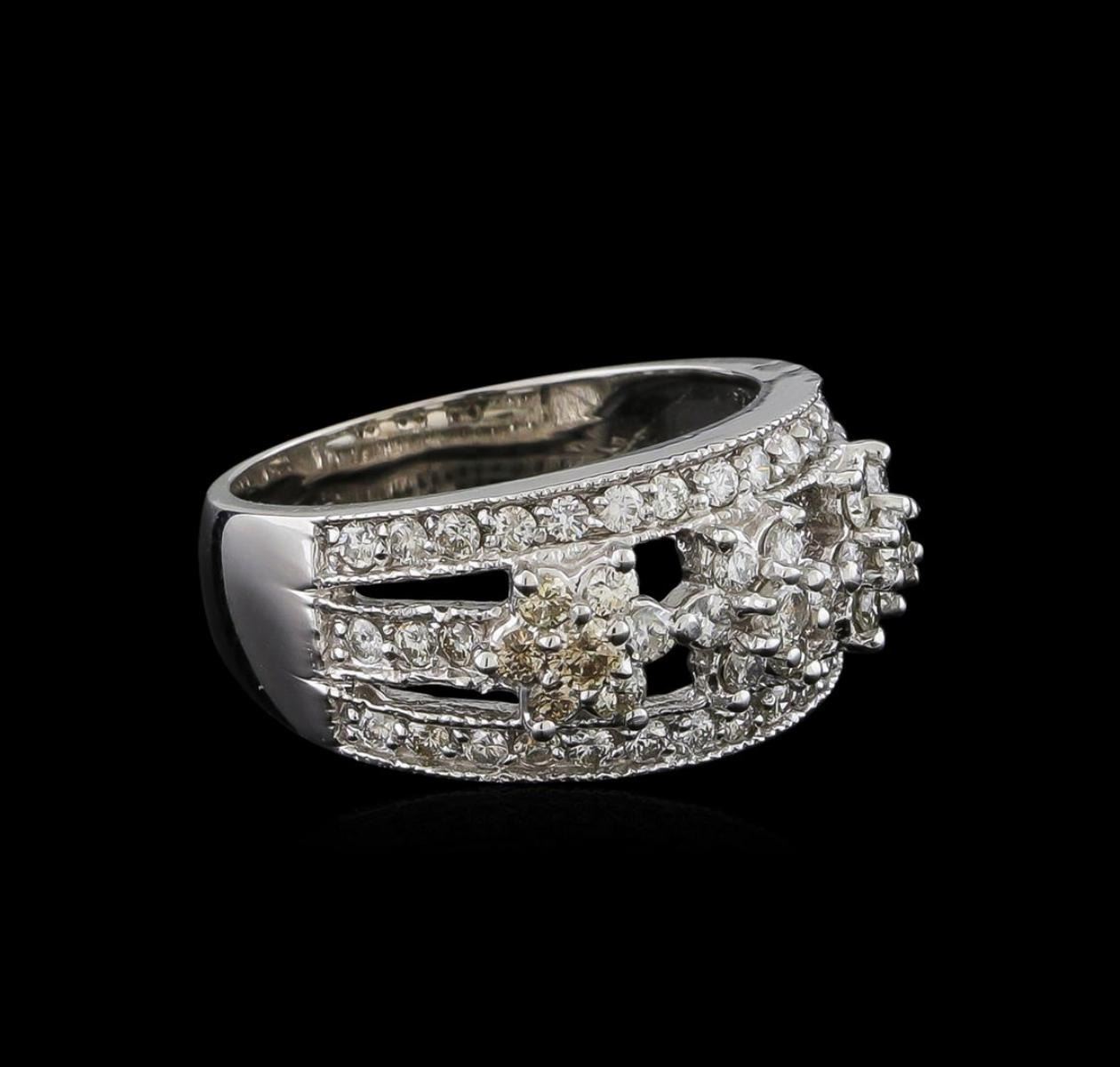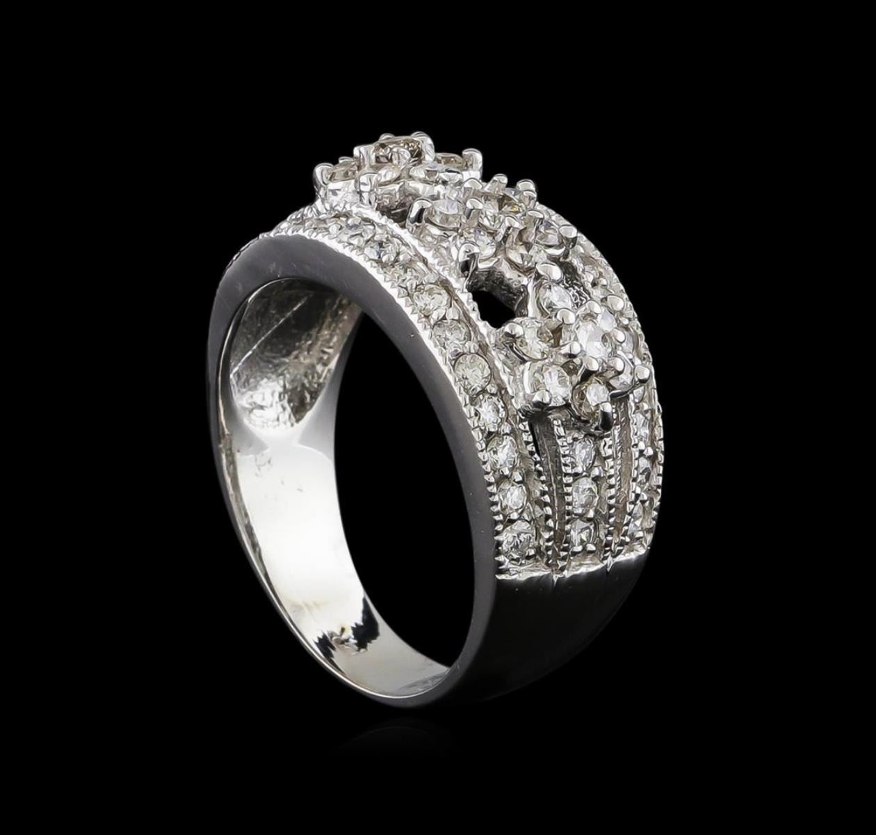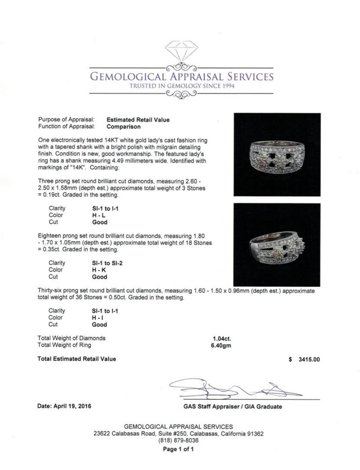 One electronically tested 14KT white gold lady's cast fashion ring with a tapered shank with a bright polish with milgrain detailing finish. The featured lady's ring has a shank measuring 4.49 millimeters wide. Identified with markings of "14K". Condition is new, good workmanship. Containing: Three prong set round brilliant cut diamonds, measuring 2.60 - 2.50 x 1.58mm (depth est.) approximate total weight of 3 Stones = 0.19ct. Graded in the setting. Clarity: SI-1 to I-1. Color: H - L. Cut Good Eighteen prong set round brilliant cut diamonds, measuring 1.80 - 1.70 x 1.05mm (depth est.) approximate total weight of 18 Stones = 0.35ct. Graded in the setting. Clarity: SI-1 to SI-2. Color: H - K. Cut Good Thirty-Six prong set round brilliant cut diamonds, measuring 1.60 - 1.50 x 0.96mm (depth est.) approximate total weight of 36 Stones = 0.50 ct. Graded in the setting. Clarity: SI-1 to I-1. Color: H - I. Cut Good. Total Weight of Diamonds 1.04ct. Total Weight of Ring 6.40gm. GAS Appraised.