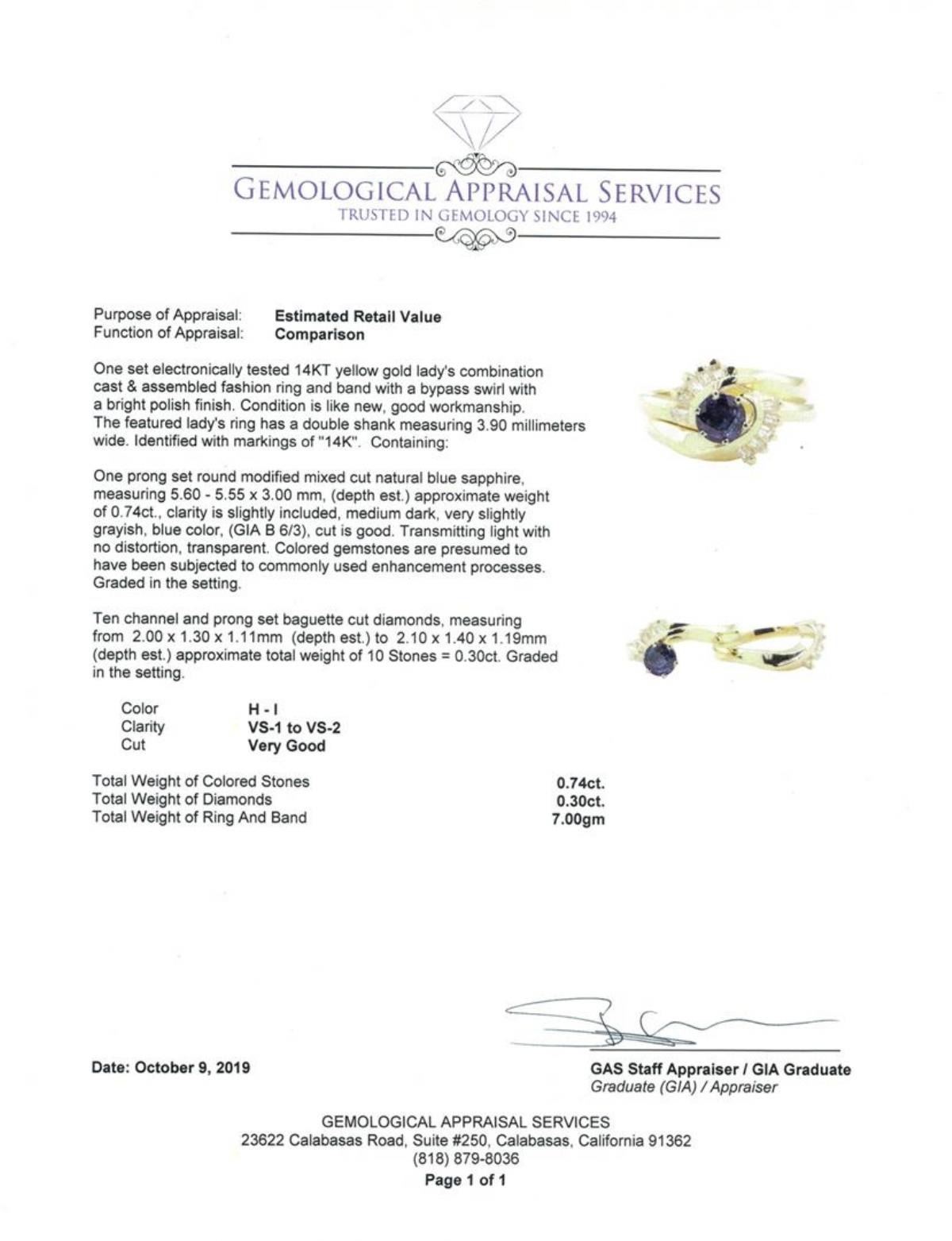 One set electronically tested 14KT yellow gold lady's combination cast & assembled fashion ring and band with a bypass swirl with a bright polish finish. The featured lady's ring has a double shank measuring 3.90 millimeters wide. Identified with markings of '14K'. Condition is Good. Containing: One prong set round modified mixed cut natural blue sapphire, measuring 5.60 - 5.55 x 3.00 mm, (depth est.) approximate weight of 0.74ct., clarity is slightly included, medium dark, very slightly grayish, blue color, (GIA B 6/3), cut is good. Transmitting light with no distortion, transparent. Colored gemstones are presumed to have been subjected to commonly used enhancement processes. Graded in the setting. Ten channel and prong set baguette cut diamonds, measuring from 2.00 x 1.30 x 1.11mm (depth est.) to 2.10 x 1.40 x 1.19mm (depth est.) approximate total weight of 10 Stones = 0.30 ct. Graded in the setting. Color H - I Clarity VS-1 to VS-2 Cut Very Good. Total Weight of Colored Stones 0.74ct.. Total Weight of Diamonds 0.30 ct.. Total Weight of Ring And Band 7.00gm GAS Appraised at $2820.00. GAS Appraised.