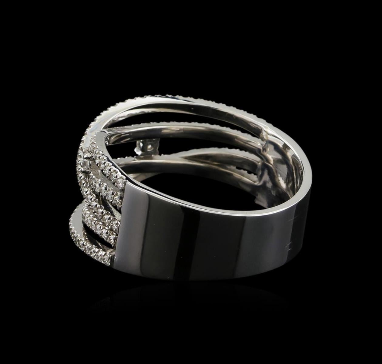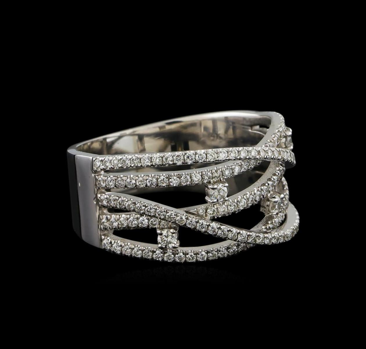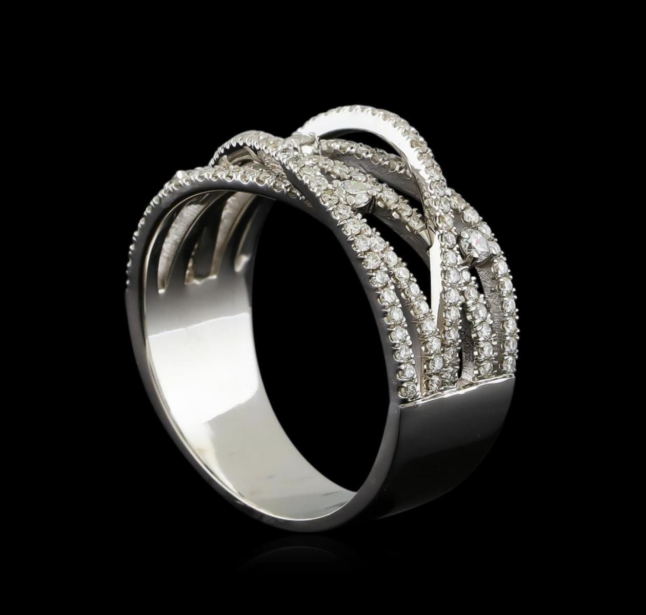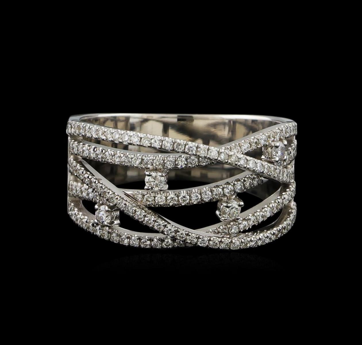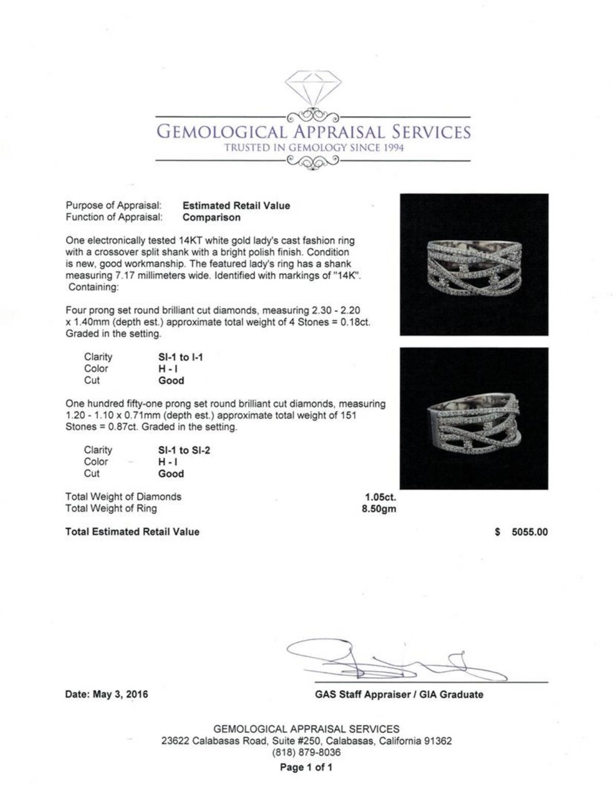 One electronically tested 14KT white gold lady's cast fashion ring with a crossover split shank with a bright polish finish. The featured lady's ring has a shank measuring 7.17 millimeters wide. Identified with markings of "14K". Condition is new, good workmanship. Containing: Four prong set round brilliant cut diamonds, measuring 2.30 - 2.20 x 1.40mm (depth est.) approximate total weight of 4 Stones = 0.18ct. Graded in the setting. Clarity: SI-1 to I-1. Color: H - I. Cut Good One Hundred Fifty-One prong set round brilliant cut diamonds, measuring 1.20 - 1.10 x 0.71mm (depth est.) approximate total weight of 151 Stones = 0.87ct. Graded in the setting. Clarity: SI-1 to SI-2. Color: H - I. Cut Good. Total Weight of Diamonds 1.05ct. Total Weight of Ring 8.50gm GAS Appraised.