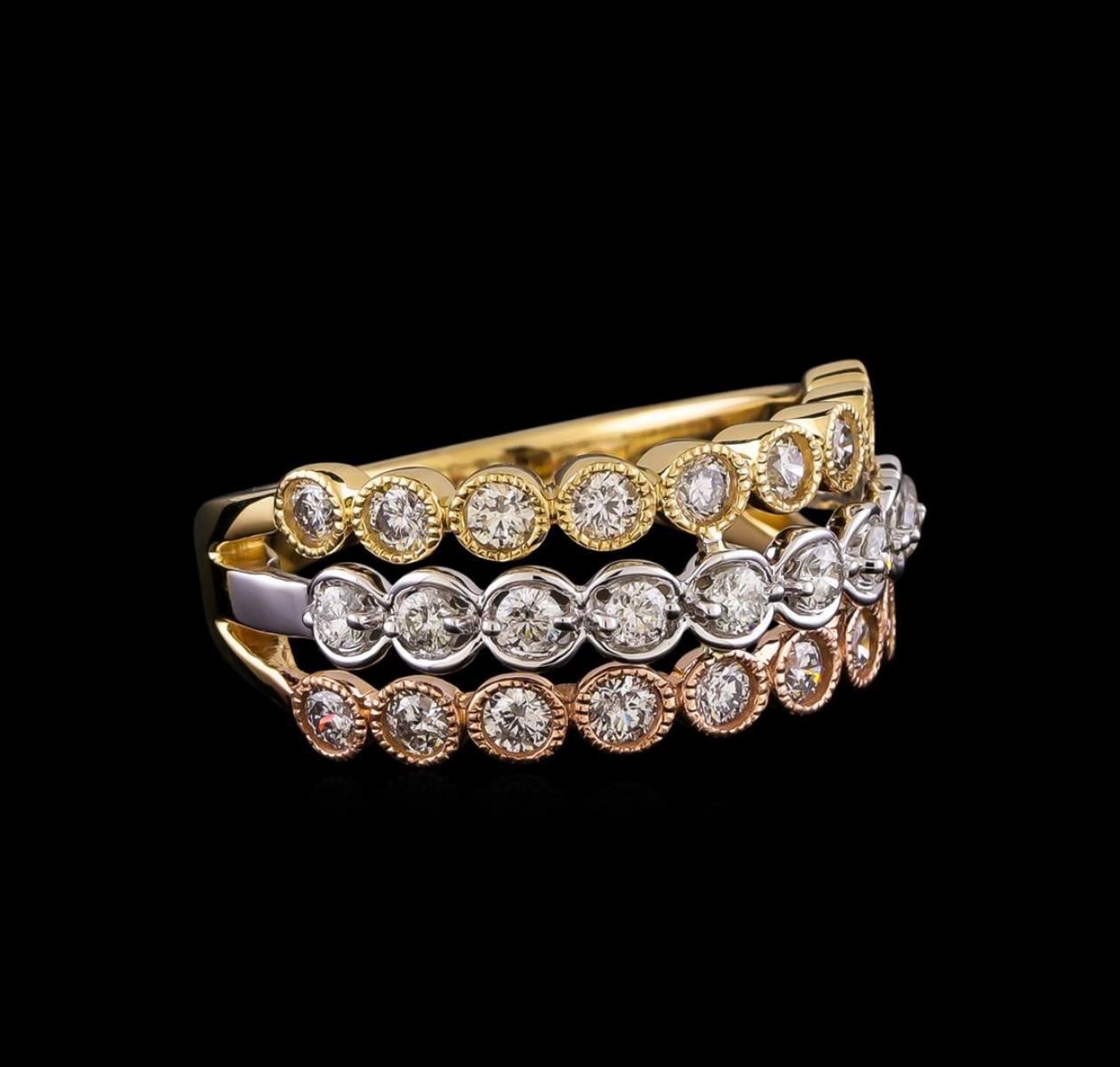 One electronically tested 14KT yellow, white, and rose gold lady's cast fashion ring with a three row wide band with a bright polish with milgrain detailing finish. The featured lady's ring has a shank measuring 2.83 millimeters in width. Identified with GAS Appraised.