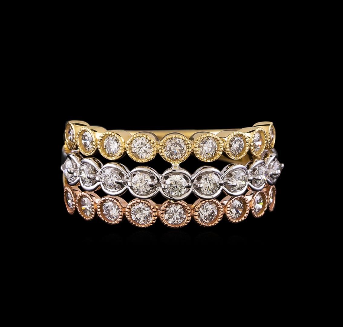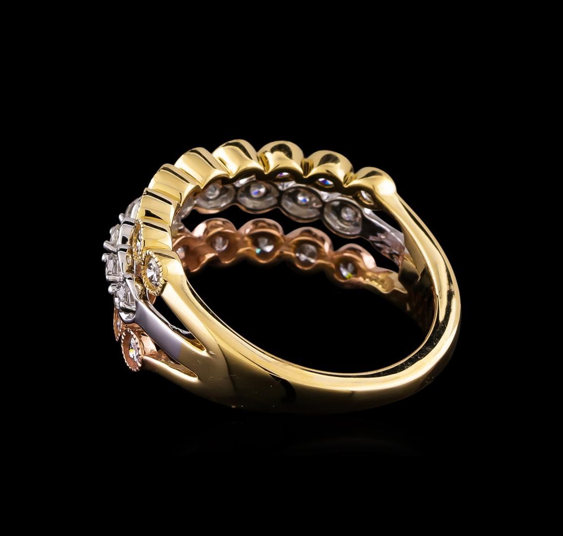 One electronically tested 14KT yellow, white, and rose gold lady's cast fashion ring with a three row wide band with a bright polish with milgrain detailing finish. The featured lady's ring has a shank measuring 2.83 millimeters in width. Identified with markings of '14K'. Condition is new, good workmanship. Containing: Nine prong set round brilliant cut diamonds, measuring 2.10 - 2.00 x 1.27mm (depth est.) approximate total weight of 9 Stones = 0.30 ct. Graded in the setting. Color H - I Clarity VS-2 to SI-1 Cut Very Good Eighteen bezel set round brilliant cut diamonds, measuring 2.30 - 2.20 x 1.35mm (depth est.) approximate total weight of 18 Stones = 0.75ct. Graded in the setting. Color H - I Clarity SI-1 to SI-2 Cut Very Good. Total Weight of Diamonds 1.05ct.. Total Weight of Ring 5.30gm GAS Appraised at $4500.00. GAS Appraised.