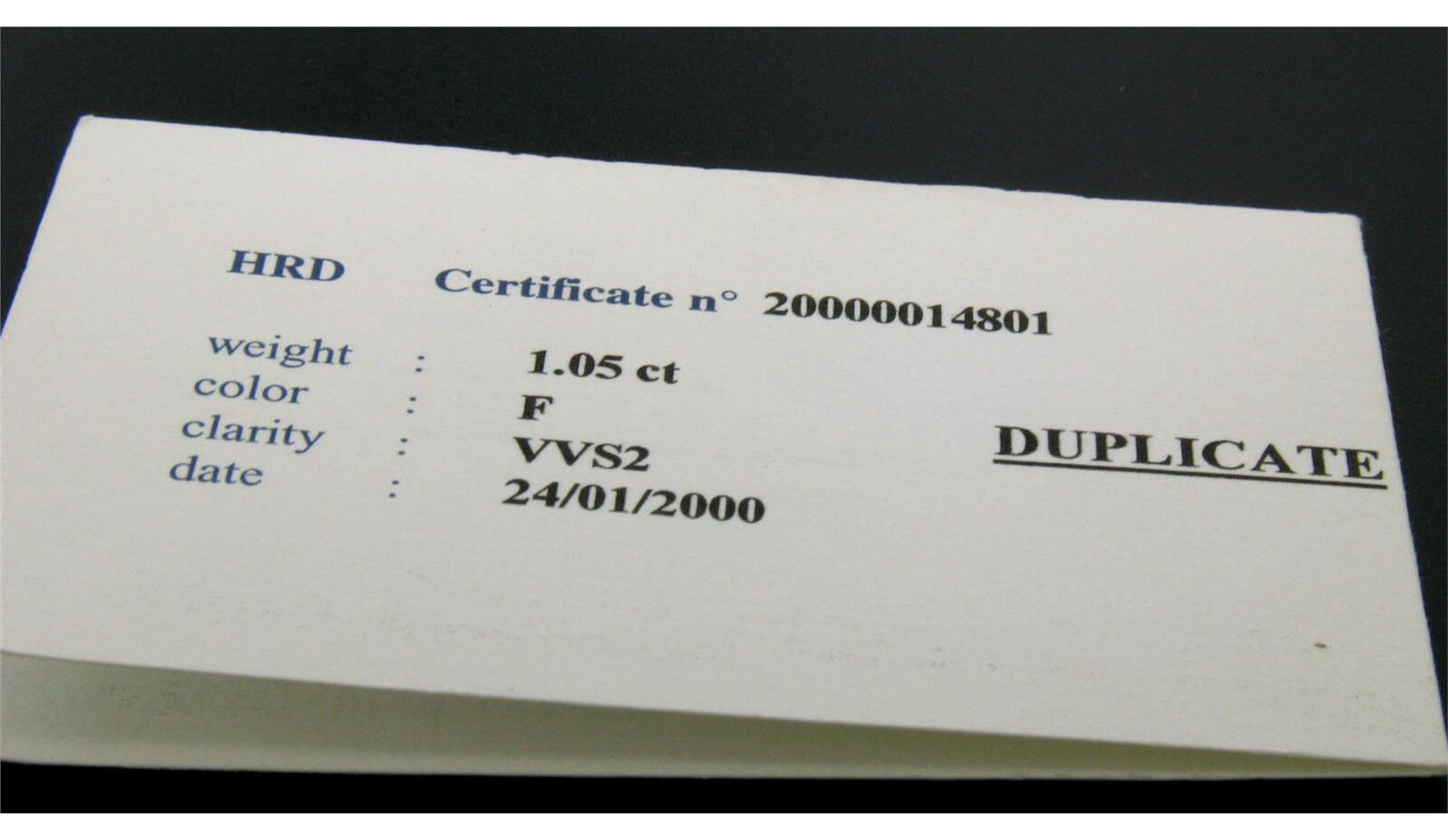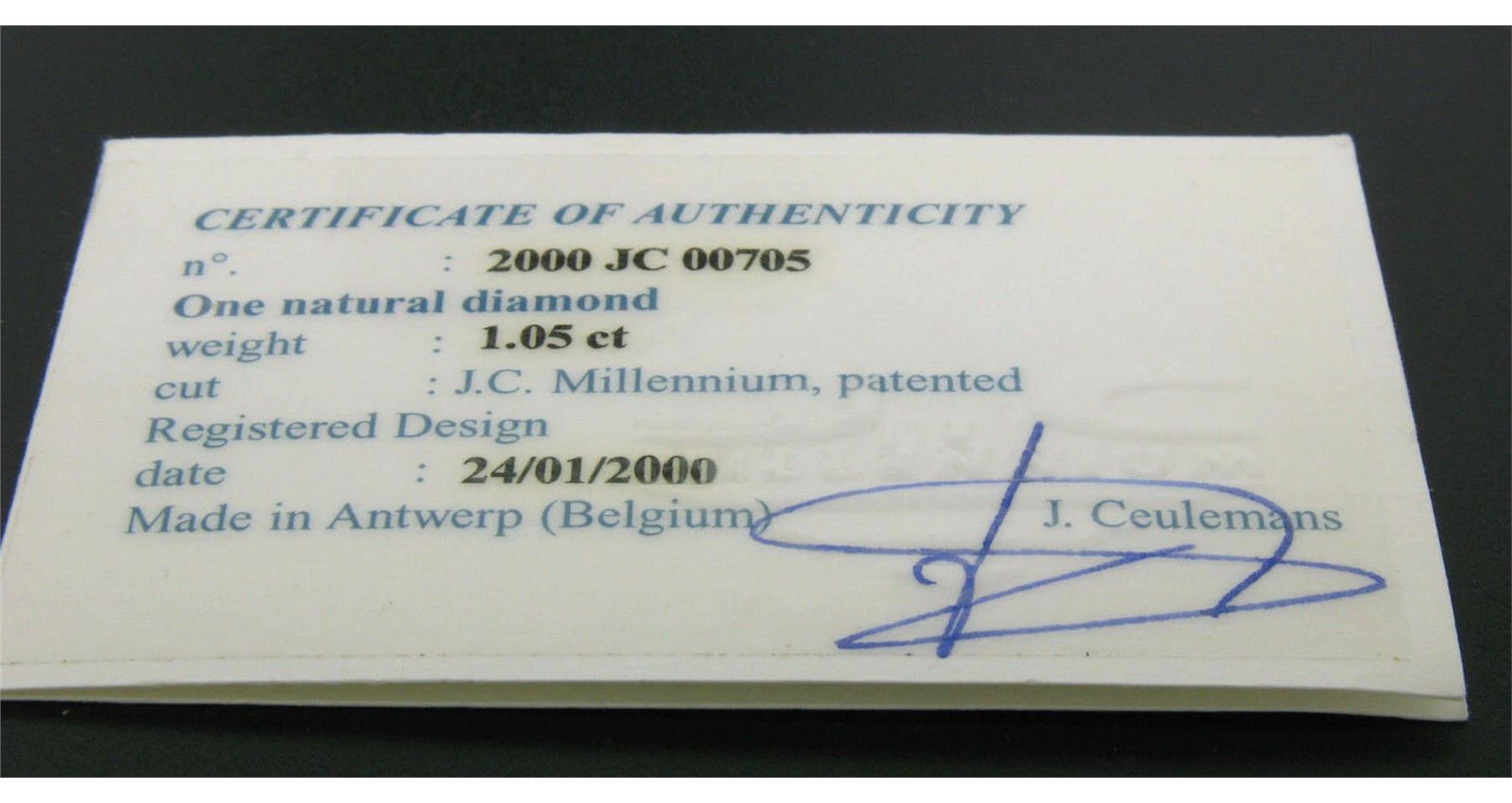 One 1.05ct J.C. Millennium Cut F VVS2 Loose Round Diamond Solitaire w/ Certification. Item Details: Shape: Round - J.C. Millennium Cut, Carat Weight: 1.05, Color: F, Clarity: VVS2, Cut: Very Good, Fluorescence: None, Certifying Company: HRD of Antwerp, Belgium (On par with the GIA), Certification Number: 20000014801 Girdle Inscription: "2000 JC 00705".