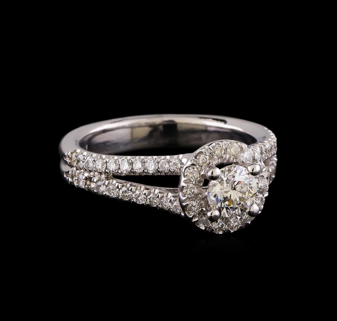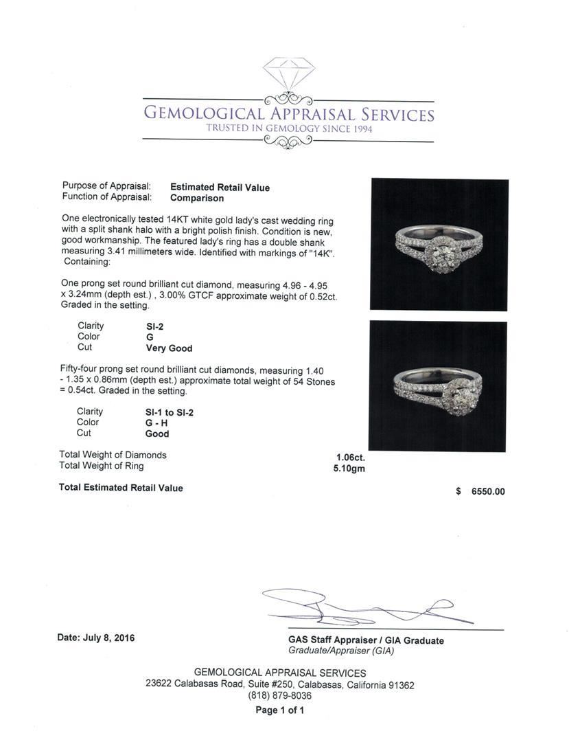 One electronically tested 14KT white gold lady's cast wedding ring with a split shank halo with a bright polish finish. The featured lady's ring has a double shank measuring 3.41 millimeters wide. Identified with markings of "14K". Condition is new, good workmanship. Containing: One prong set round brilliant cut diamond, measuring 4.96 - 4.95 x 3.24mm (depth est.) , 3.00.%. GTCF approximate weight of 0.52ct. Graded in the setting. Clarity: SI-2. Color: G. Cut Very Good Fifty-Four prong set round brilliant cut diamonds, measuring 1.40 - 1.35 x 0.86mm (depth est.) approximate total weight of 54 Stones = 0.54ct. Graded in the setting. Clarity: SI-1 to SI-2. Color: G - Good. Total Weight of Diamonds 1.06ct. Total Weight of Ring 5.10gm. GAS Appraised.