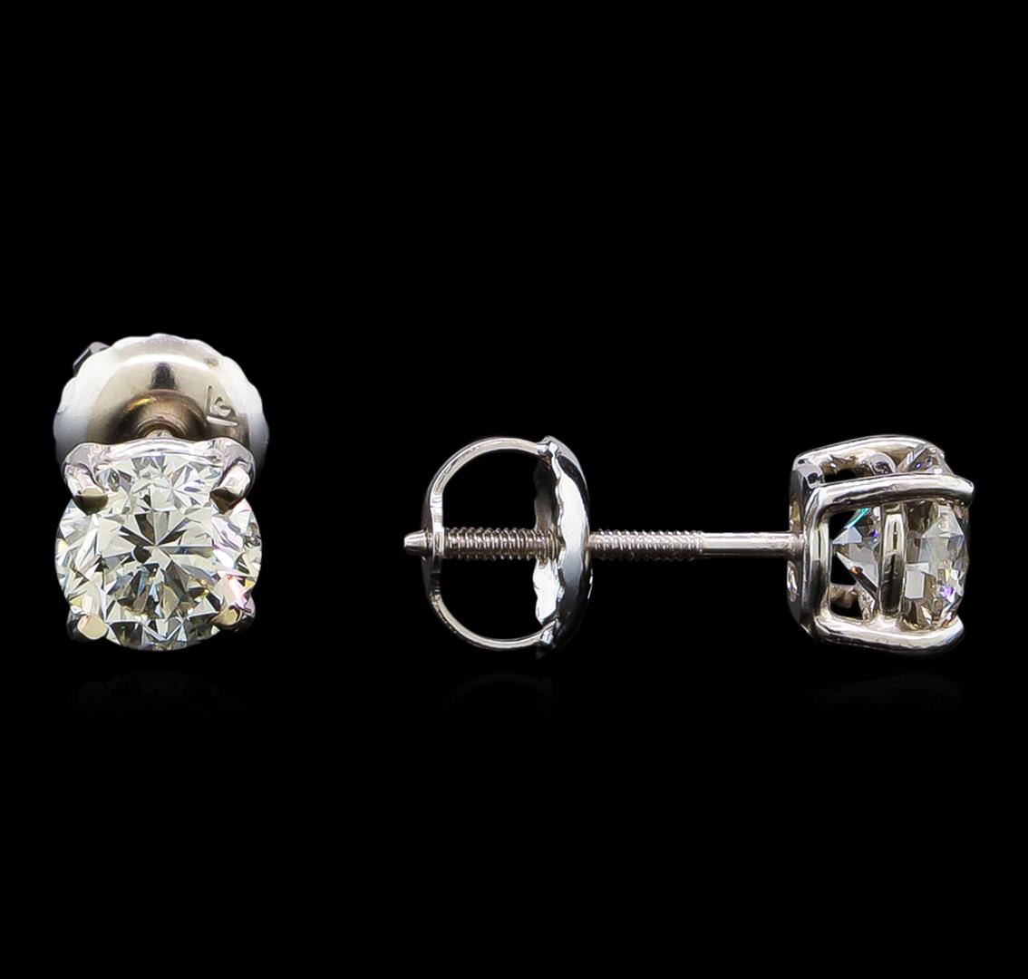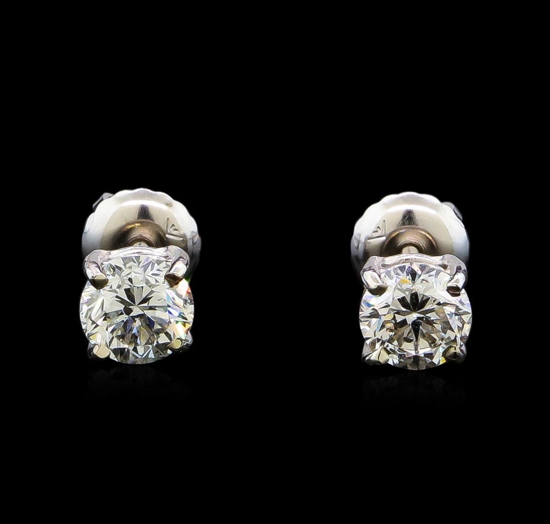 One pair electronically tested 14KT white gold lady's combination cast & assembled diamond stud earrings with threaded posts and screw-on/screw-off backs with a basket setting with a bright polish finish. Identified with markings of "14K". Condition is new, good workmanship. Containing: One prong set round brilliant cut diamond, measuring 5.06 - 5.03 x 3.49mm (depth est.) approximate weight of 0.54ct. Graded in the setting. Clarity: SI-2. Color: Very Good One prong set round brilliant cut diamond, measuring 4.99 - 4.97 x 3.24mm (depth est.) approximate weight of 0.52ct. Graded in the setting. Clarity: SI-2. Color: H - I. Cut Good. Total Weight of Diamonds 1.06ct. Total Weight of Stud Earrings 1.00gm. GAS Appraised.