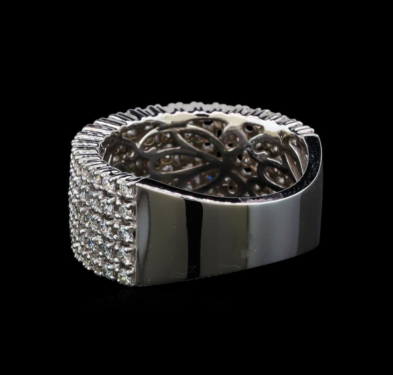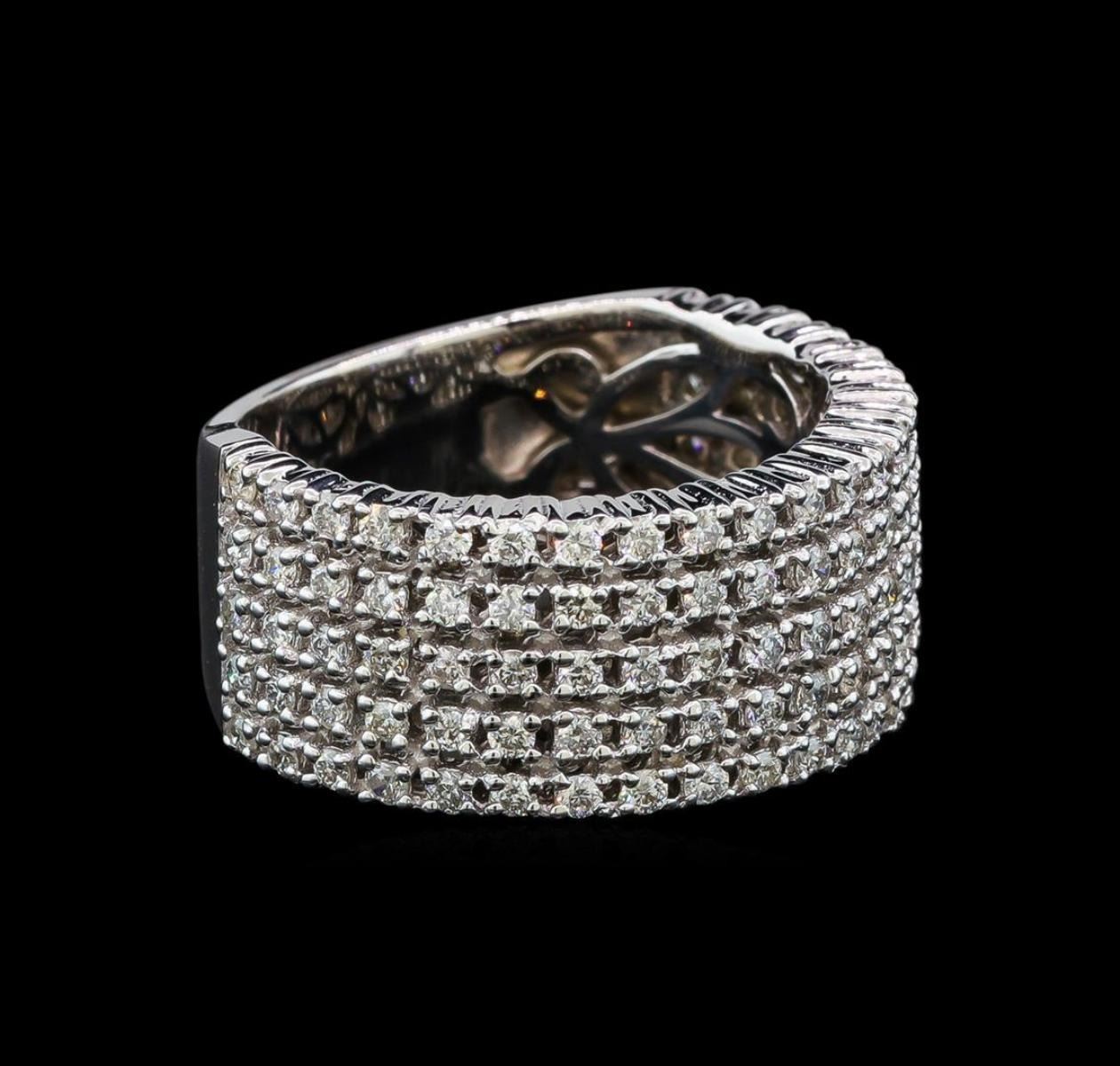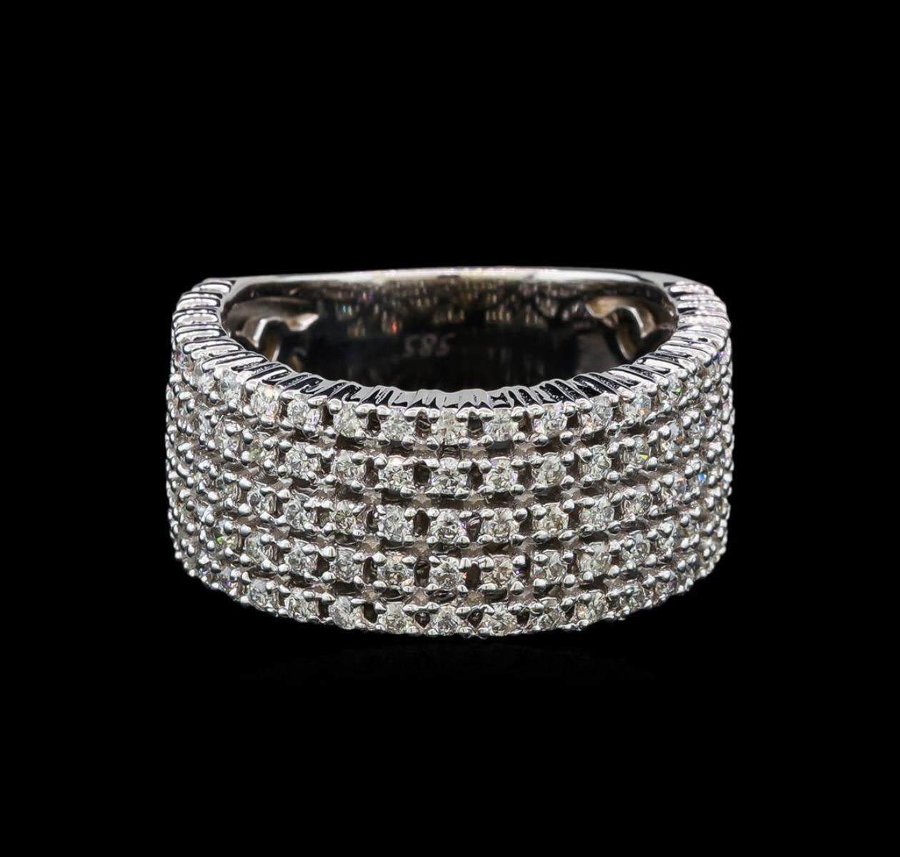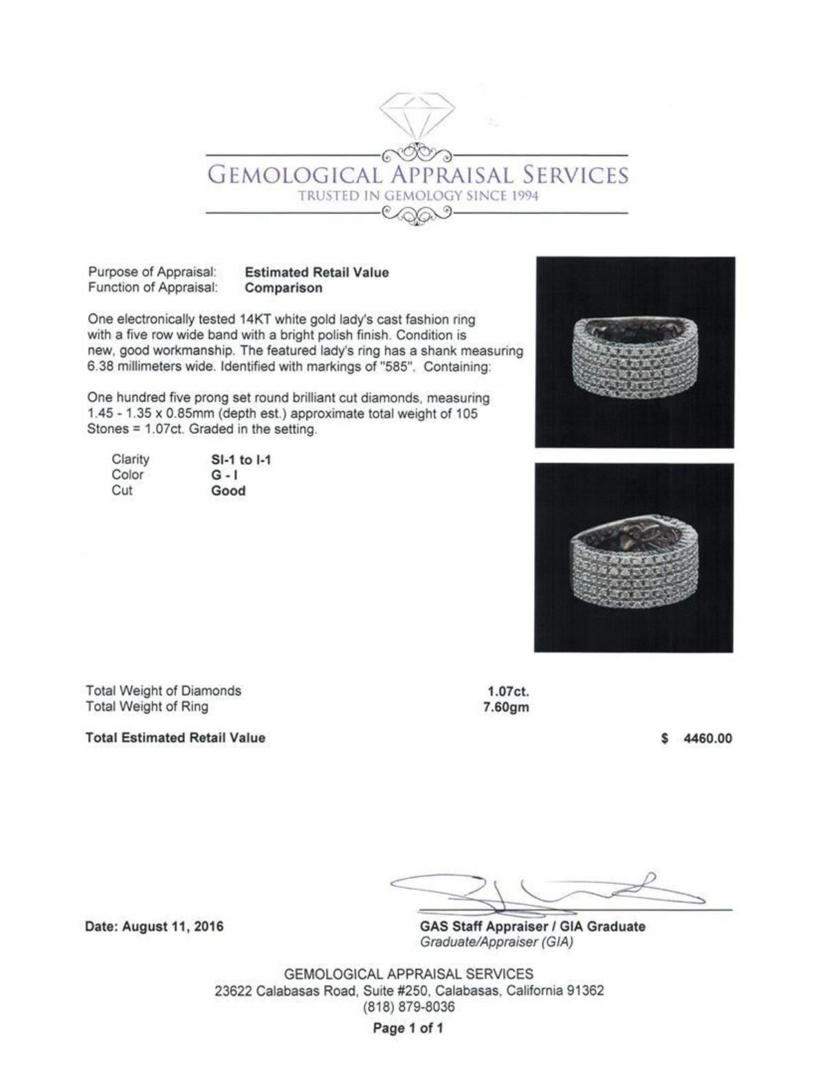 One electronically tested 14KT white gold lady's cast fashion ring with a five row wide band with a bright polish finish. The featured lady's ring has a shank measuring 6.38 millimeters wide. Identified with markings of '585'. Condition is new, good workmanship. Containing: One Hundred Five prong set round brilliant cut diamonds, measuring 1.45 - 1.35 x 0.85mm (depth est.) approximate total weight of 105 Stones = 1.07ct. Graded in the setting. Clarity SI-1 to I-1. Color: G - I Cut Good. Total Weight of Diamonds 1.07ct.. Total Weight of Ring 7.60gm. GAS Appraised.