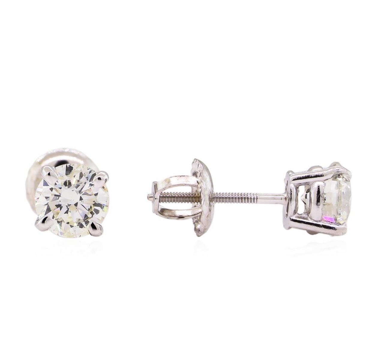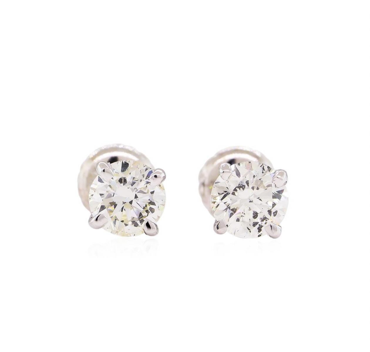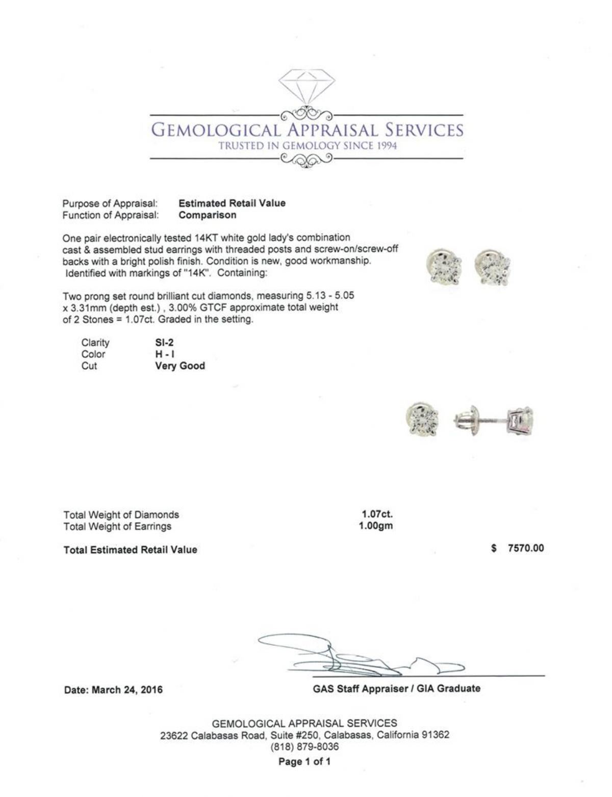 One pair electronically tested 14KT white gold lady's combination cast & assembled stud earrings with threaded posts and screw-on/screw-off backs with a bright polish finish. Identified with markings of "14K". Condition is new, good workmanship. Containing: Two prong set round brilliant cut diamonds, measuring 5.13 - 5.05 x 3.31mm (depth est.) , 3.00.%. GTCF approximate total weight of 2 Stones = 1.07ct. Graded in the setting. Clarity: SI-2. Color: H - I. Cut Very Good. Total Weight of Diamonds 1.07ct. Total Weight of Earrings 1.00gm. GAS Appraised at $7,570.00.