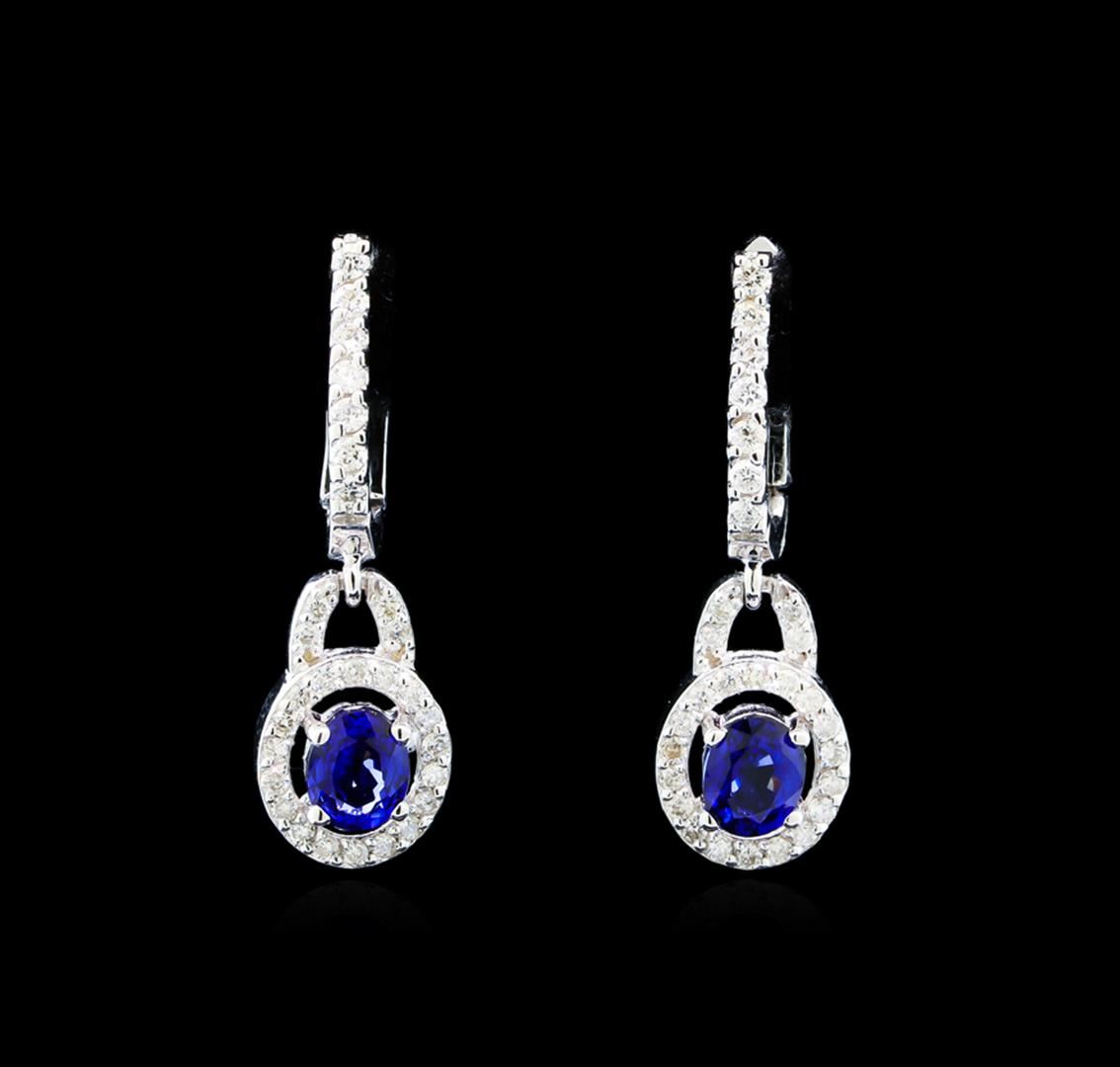 One pair of earrings featuring: 14KT white gold weighing 3.47 grams containing two sapphires weighing 1.07ctw and diamonds weighing 0.43ctw.