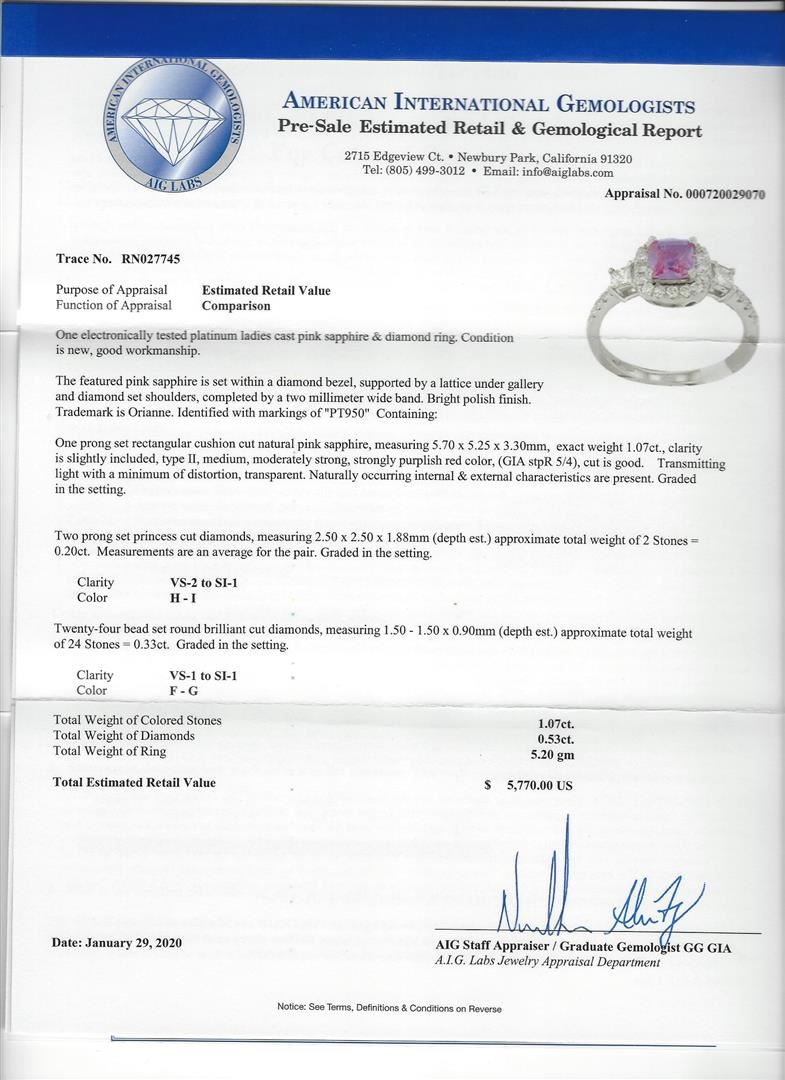One 1.07ct Sapphire and Diamond Ring - Platinum. AIG certified. See Appraisal for more details. AIG Appraised.