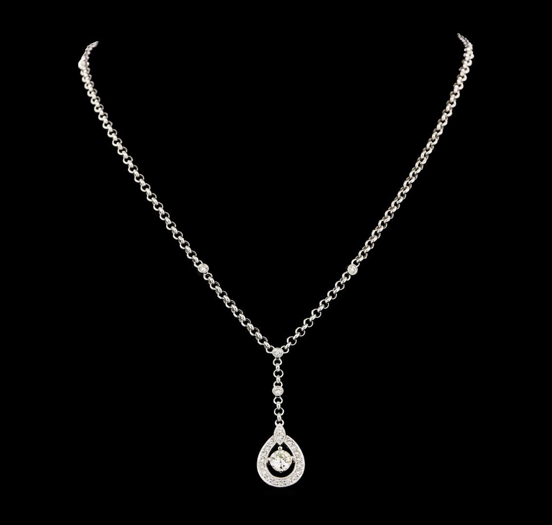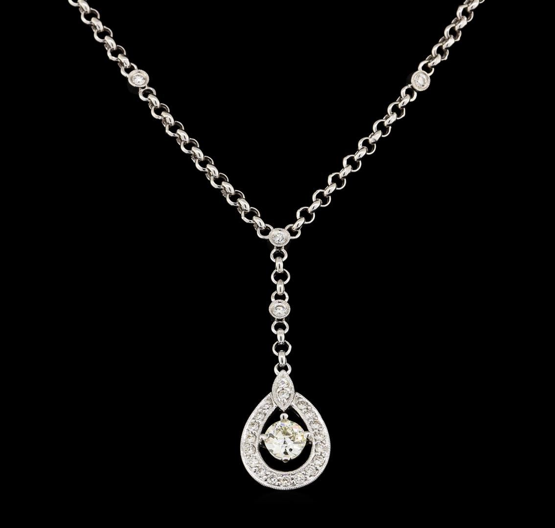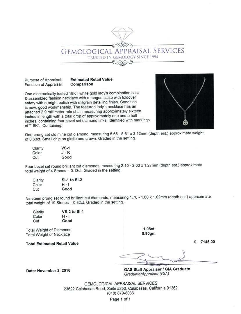One electronically tested 18KT white gold lady's combination cast & assembled fashion necklace with a tongue clasp with foldover safety with a bright polish with milgrain detailing finish. The featured lady's necklace has an attached 2.9 millimeter rolo chain measuring approximately sixteen inches in length with a total drop of approximately one and a half inches, containing four bezel set diamond links. Identified with markings of '18K'. Condition is new, good workmanship. Containing: One prong set old mine cut diamond, measuring 5.66 - 5.61 x 3.12mm (depth est.) approximate weight of 0.63ct. Small chip on girdle and crown. Graded in the setting. Clarity VS-1. Color: J - K Cut Good Four bezel set round brilliant cut diamonds, measuring 2.10 - 2.00 x 1.27mm (depth est.) approximate total weight of 4 Stones = 0.13ct. Graded in the setting. Clarity SI-1 to SI-2. Color: H - I Cut Good Nineteen prong set round brilliant cut diamonds, measuring 1.70 - 1.60 x 1.02mm (depth est.) approximate total weight of 19 Stones = 0.32ct. Graded in the setting. Clarity VS-2 to SI-1. Color: H - I Cut Good. Total Weight of Diamonds 1.08ct.. Total Weight of Necklace 8.90gm. GAS Appraised.