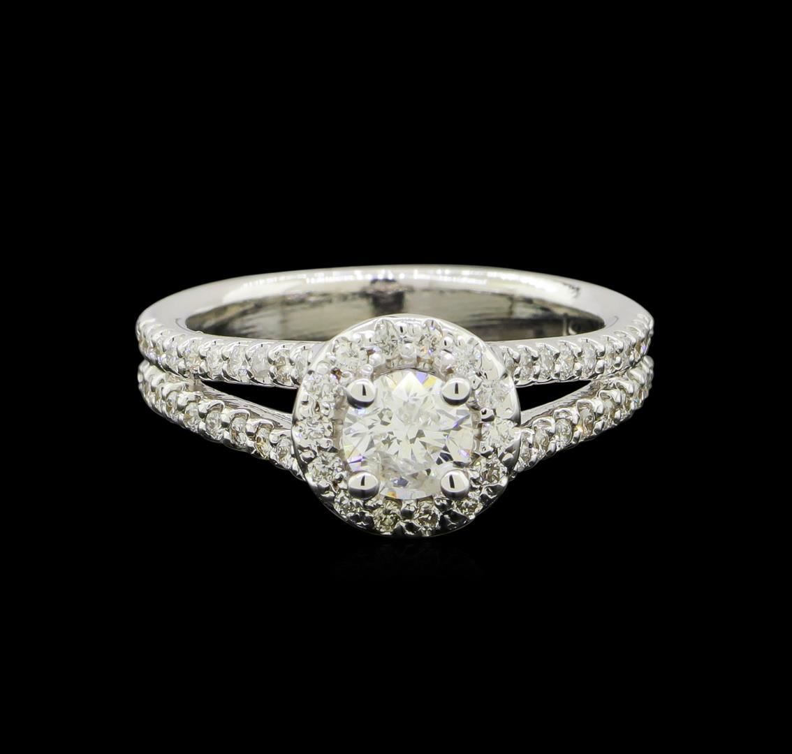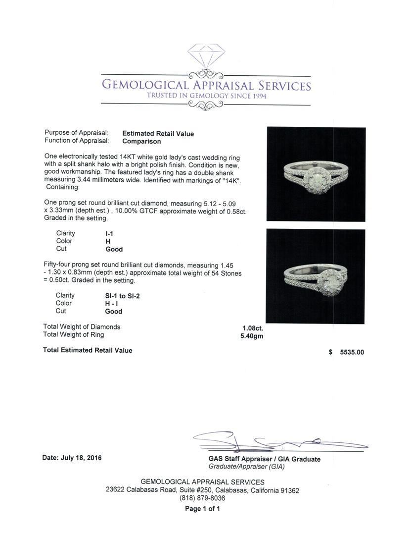 One electronically tested 14KT white gold lady's cast wedding ring with a split shank halo with a bright polish finish. The featured lady's ring has a double shank measuring 3.44 millimeters wide. Identified with markings of '14K'. Condition is new, good workmanship. Containing: One prong set round brilliant cut diamond, measuring 5.12 - 5.09 x 3.33mm (depth est.) , 10.00.%. GTCF approximate weight of 0.58ct. Graded in the setting. Clarity I-1. Color: H Cut Good Fifty-Four prong set round brilliant cut diamonds, measuring 1.45 - 1.30 x 0.83mm (depth est.) approximate total weight of 54 Stones = 0.50ct. Graded in the setting. Clarity SI-1 to SI-2. Color: H - I Cut Good. Total Weight of Diamonds 1.08ct.. Total Weight of Ring 5.40gm. GAS Appraised.