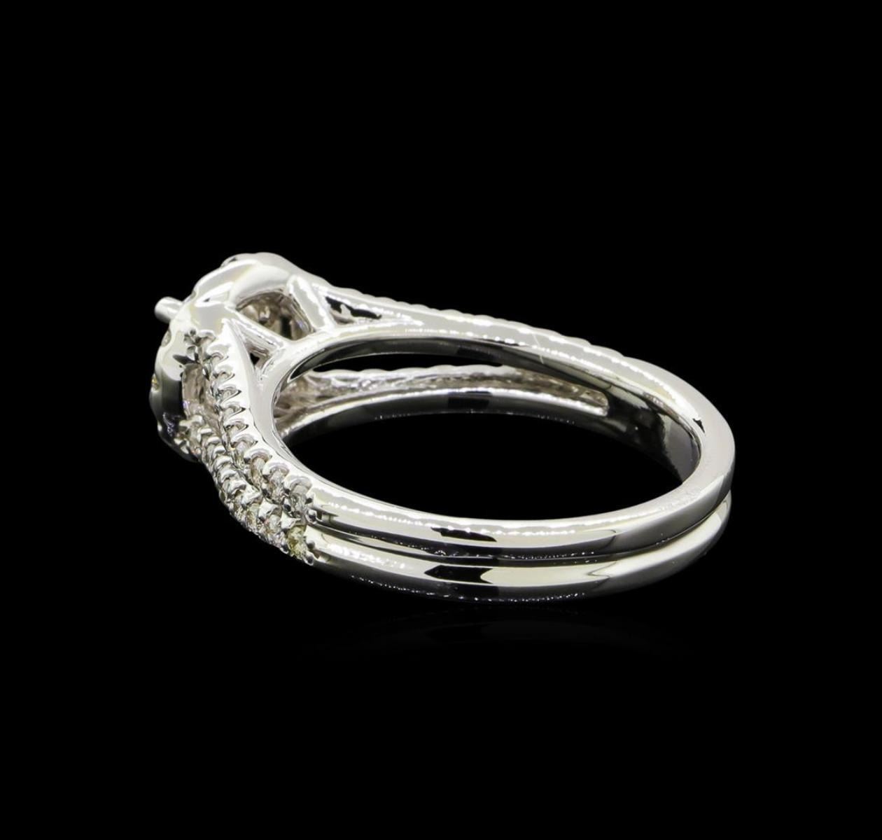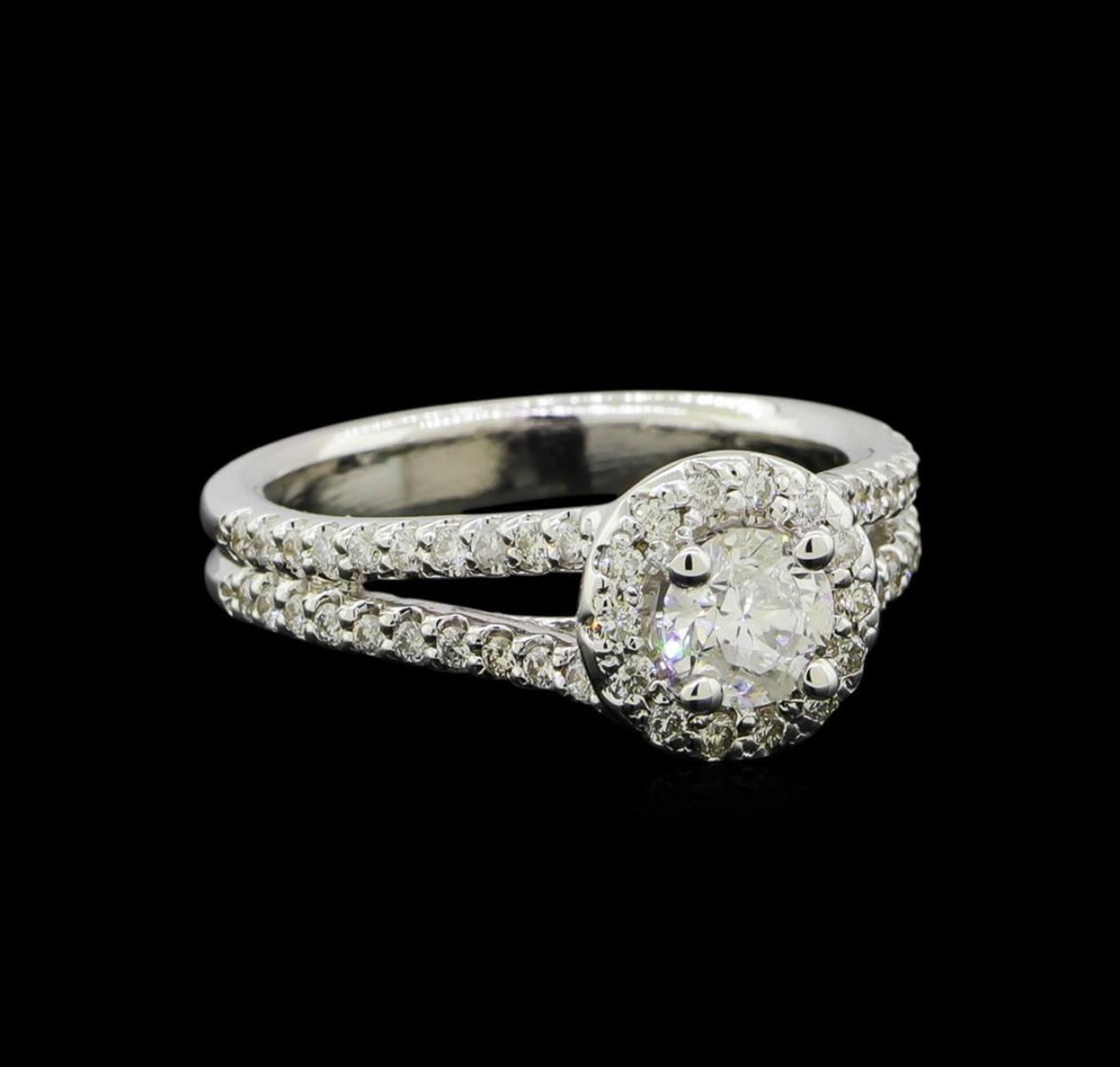 One electronically tested 14KT white gold lady's cast wedding ring with a split shank halo with a bright polish finish. The featured lady's ring has a double shank measuring 3.44 millimeters wide. Identified with markings of '14K'. Condition is new, good workmanship. Containing: One prong set round brilliant cut diamond, measuring 5.12 - 5.09 x 3.33mm (depth est.) , 10.00.%. GTCF approximate weight of 0.58ct. Graded in the setting. Clarity I-1. Color: H Cut Good Fifty-Four prong set round brilliant cut diamonds, measuring 1.45 - 1.30 x 0.83mm (depth est.) approximate total weight of 54 Stones = 0.50ct. Graded in the setting. Clarity SI-1 to SI-2. Color: H - I Cut Good. Total Weight of Diamonds 1.08ct.. Total Weight of Ring 5.40gm. GAS Appraised.
