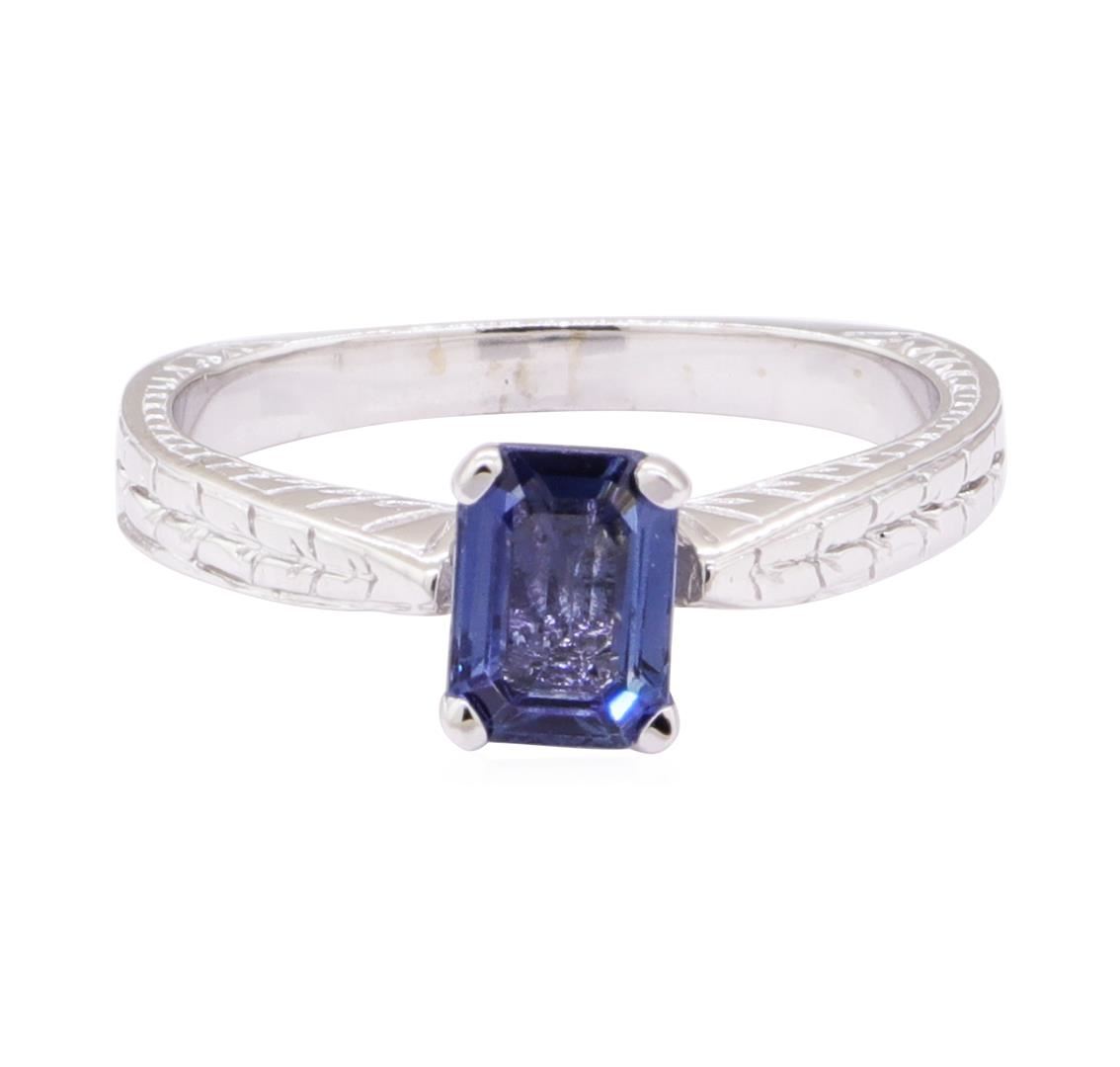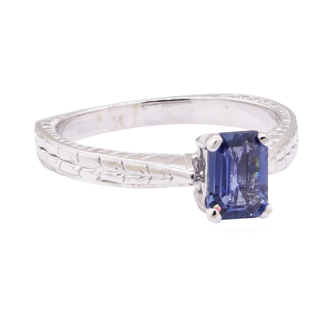One ring featuring: 14KT white gold weighing 3.9 grams containing one emerald cut blue sapphire weighing 1.09ct. The featured ring is a pinched solitaire ring with a European shank with vintage style engraving.