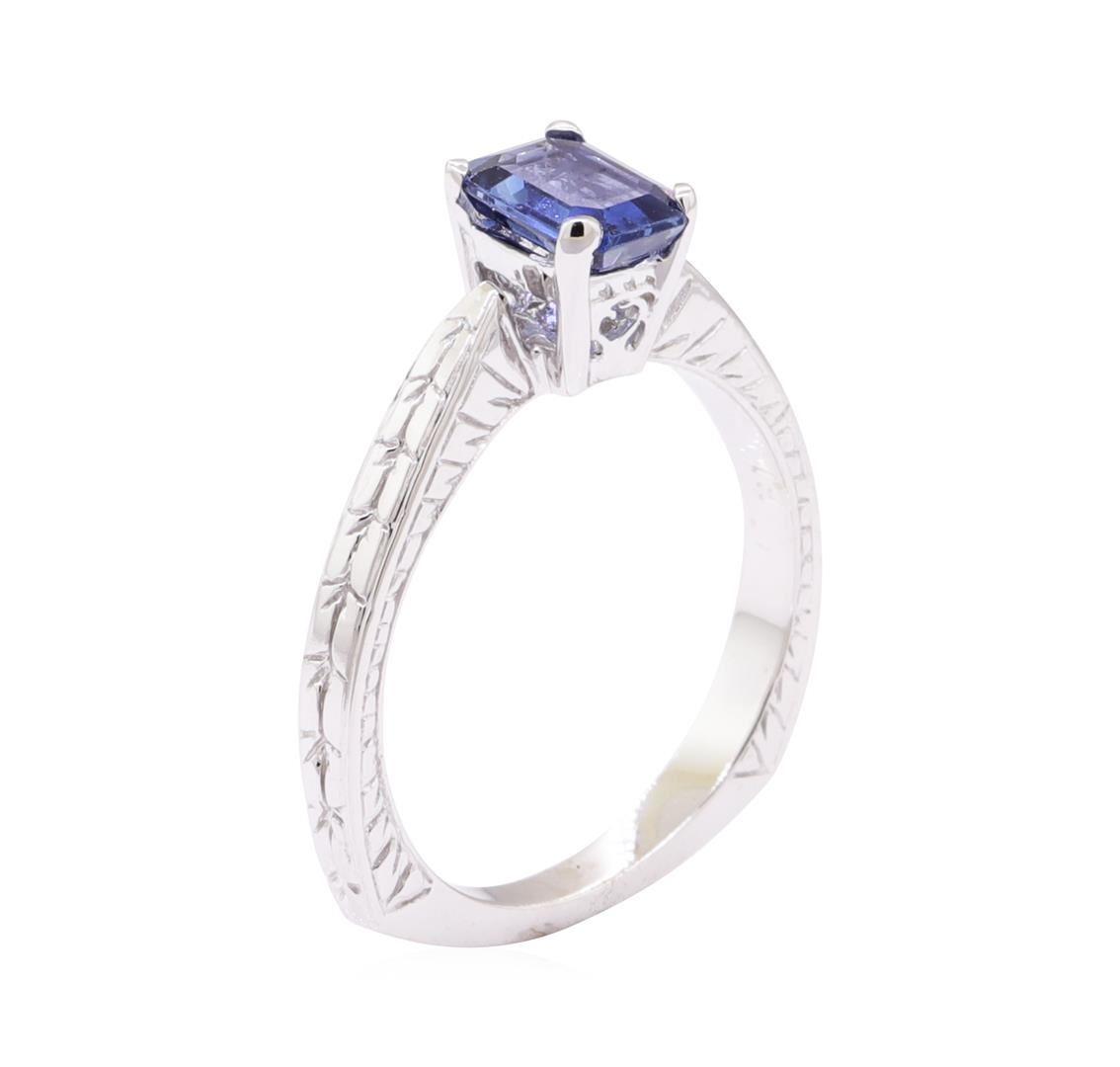 One ring featuring: 14KT white gold weighing 3.9 grams containing one emerald cut blue sapphire weighing 1.09ct. The featured ring is a pinched solitaire ring with a European shank with vintage style engraving.