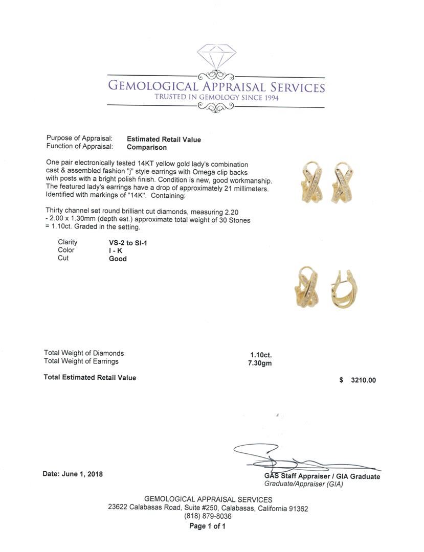 One pair electronically tested 14KT yellow gold lady's combination cast & assembled fashion 'j' style earrings with Omega clip backs with posts with a bright polish finish. The featured lady's earrings have a drop of approximately 21 millimeters. Identified with markings of '14K'. Condition is new, good workmanship. Containing: Thirty channel set round brilliant cut diamonds, measuring 2.20 - 2.00 x 1.30mm (depth est.) approximate total weight of 30 Stones = 1.10ct. Graded in the setting. Color I - K Clarity VS-2 to SI-1 Cut Good. Total Weight of Diamonds 1.10ct.. Total Weight of Earrings 7.30gm GAS Appraised at $3210.00. GAS Appraised.