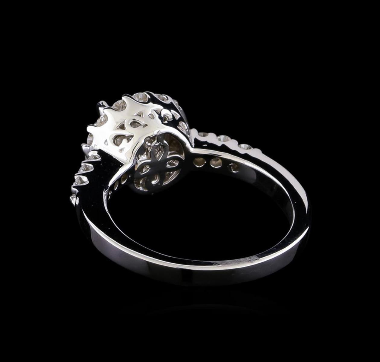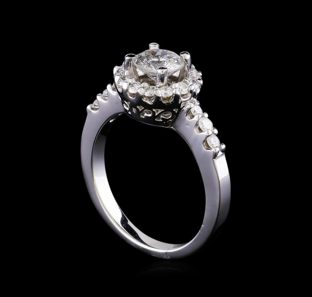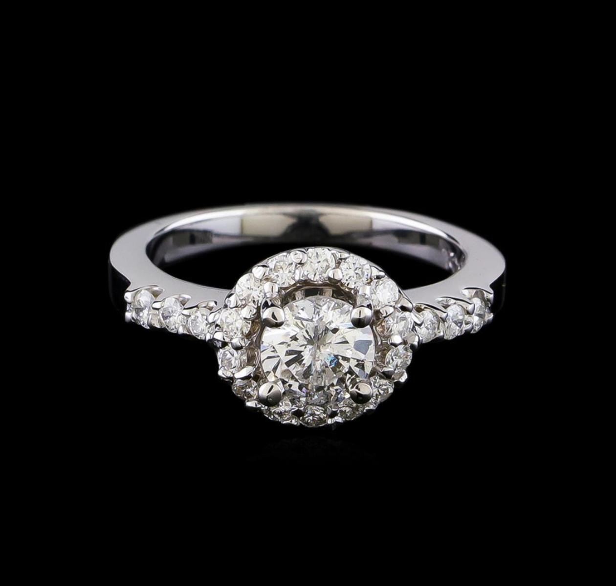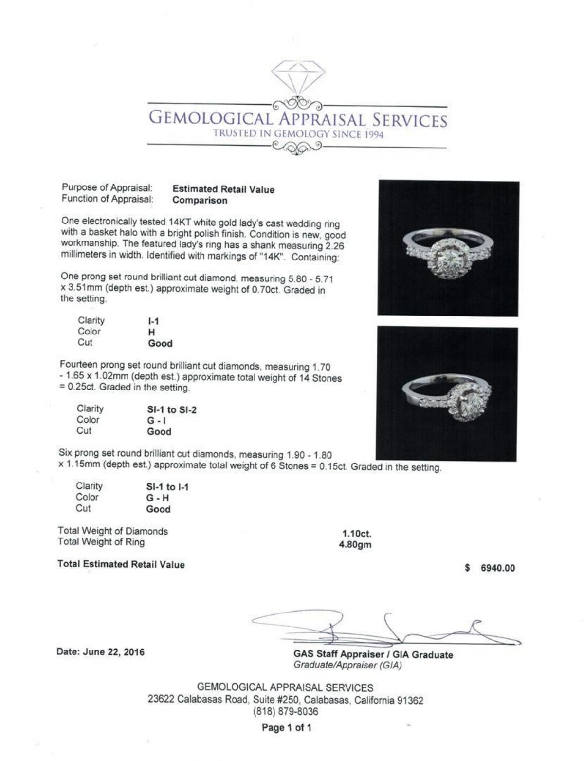 One electronically tested 14KT white gold lady's cast wedding ring with a basket halo with a bright polish finish. The featured lady's ring has a shank measuring 2.26 millimeters in width. Identified with markings of "14K". Condition is new, good workmanship. Containing: One prong set round brilliant cut diamond, measuring 5.80 - 5.71 x 3.51mm (depth est.) approximate weight of 0.70ct. Graded in the setting. Clarity: I-1. Color: Good Fourteen prong set round brilliant cut diamonds, measuring 1.70 - 1.65 x 1.02mm (depth est.) approximate total weight of 14 Stones = 0.25ct. Graded in the setting. Clarity: SI-1 to SI-2. Color: G - I. Cut Good Six prong set round brilliant cut diamonds, measuring 1.90 - 1.80 x 1.15mm (depth est.) approximate total weight of 6 Stones = 0.15ct. Graded in the setting. Clarity: SI-1 to I-1. Color: G - Good. Total Weight of Diamonds 1.10ct. Total Weight of Ring 4.80gm. GAS Appraised.