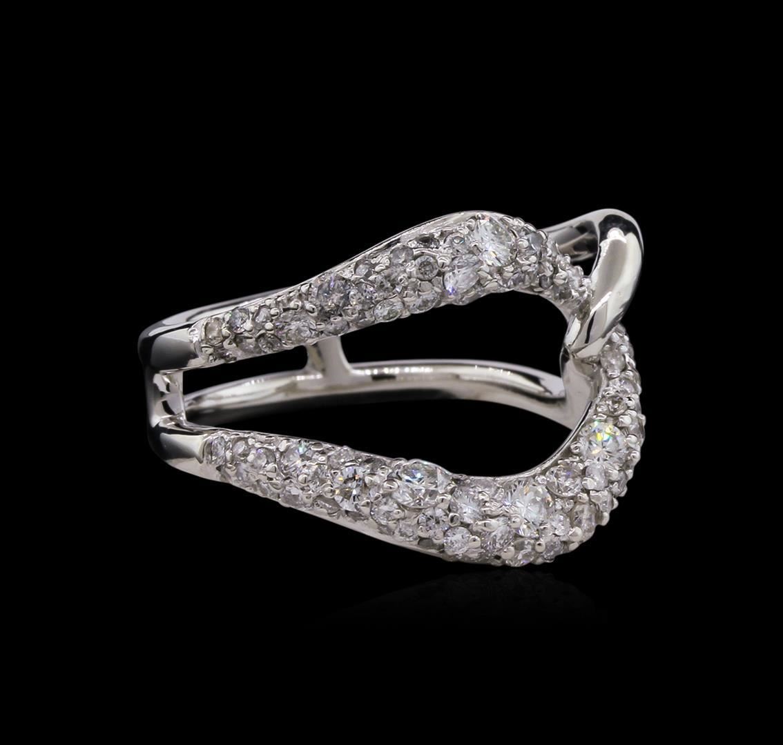 One electronically tested 14KT white gold lady's cast fashion ring with a double shank with a bright polish finish. The featured lady's ring has a linked freeform motif and a double shank measuring 5.58 millimeters wide. Identified with markings of "585". Condition is new, good workmanship. Containing: Four prong set round brilliant cut diamonds, measuring 2.80 - 2.50 x 1.59mm (depth est.) approximate total weight of 4 Stones = 0.26ct. Graded in the setting. Clarity: VS-2 to SI-1. Color: H - I. Cut Good Nineteen prong set round brilliant cut diamonds, measuring 2.10 - 1.50 x 1.08mm (depth est.) approximate total weight of 19 Stones = 0.41ct. Graded in the setting. Clarity: SI-1 to I-1. Color: H - I. Cut Good Sixty prong set round brilliant cut diamonds, measuring 1.30 - 1.20 x 0.75mm (depth est.) approximate total weight of 60 Stones = 0.43ct. Graded in the setting. Clarity: SI-1 to I-1. Color: H - I. Cut Good. Total Weight of Diamonds 1.10ct. Total Weight of Ring 5.80gm. GAS Appraised at $4,085.00. GAS Appraised.