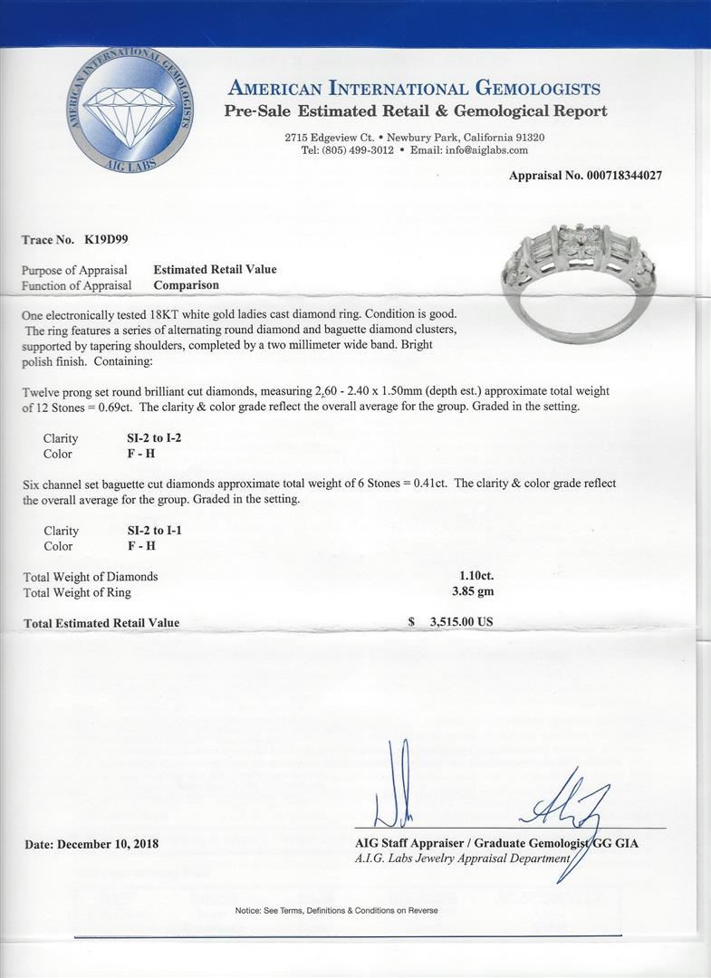 One 1.10ctw Diamond Ring - 18KT White Gold. AIG certified. See Appraisal for more details. AIG Appraised.