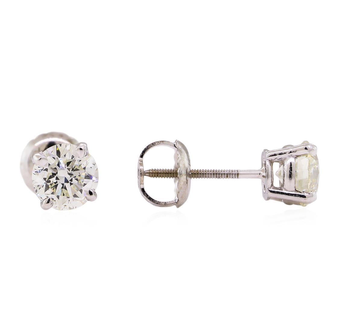 One pair electronically tested 14KT white gold lady's combination cast & assembled stud earrings with threaded posts and screw-on/screw-off backs with a bright polish finish. Identified with markings of "14K". Condition is new, good workmanship. Containing: Two prong set round brilliant cut diamonds, measuring 5.23 - 5.20 x 3.29mm (depth est.) approximate total weight of 2 Stones = 1.10ct. Graded in the setting. Clarity: SI-1 to SI-2. Color: H - I. Cut Very Good. Total Weight of Diamonds 1.10ct. Total Weight of Earrings 1.00gm. GAS Appraised.