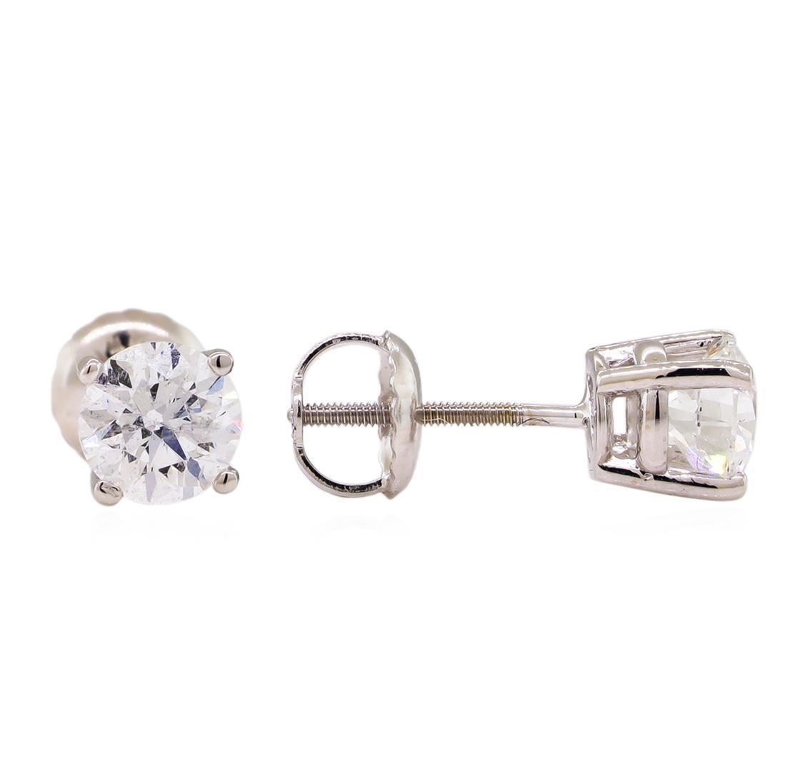 One pair electronically tested 14KT white gold lady's combination cast & assembled stud earrings with threaded posts and screw-on/screw-off backs with a bright polish finish. Identified with markings of "14K". Condition is new, good workmanship. Containing: Two prong set round brilliant cut diamonds, measuring 5.17 - 5.12 x 3.30mm (depth est.) approximate total weight of 2 Stones = 1.10 ct. Graded in the setting. Clarity: I-1. Color: F - Very Good. Total Weight of Diamonds 1.10 ct. Total Weight of Earrings 1.00gm. GAS Appraised.