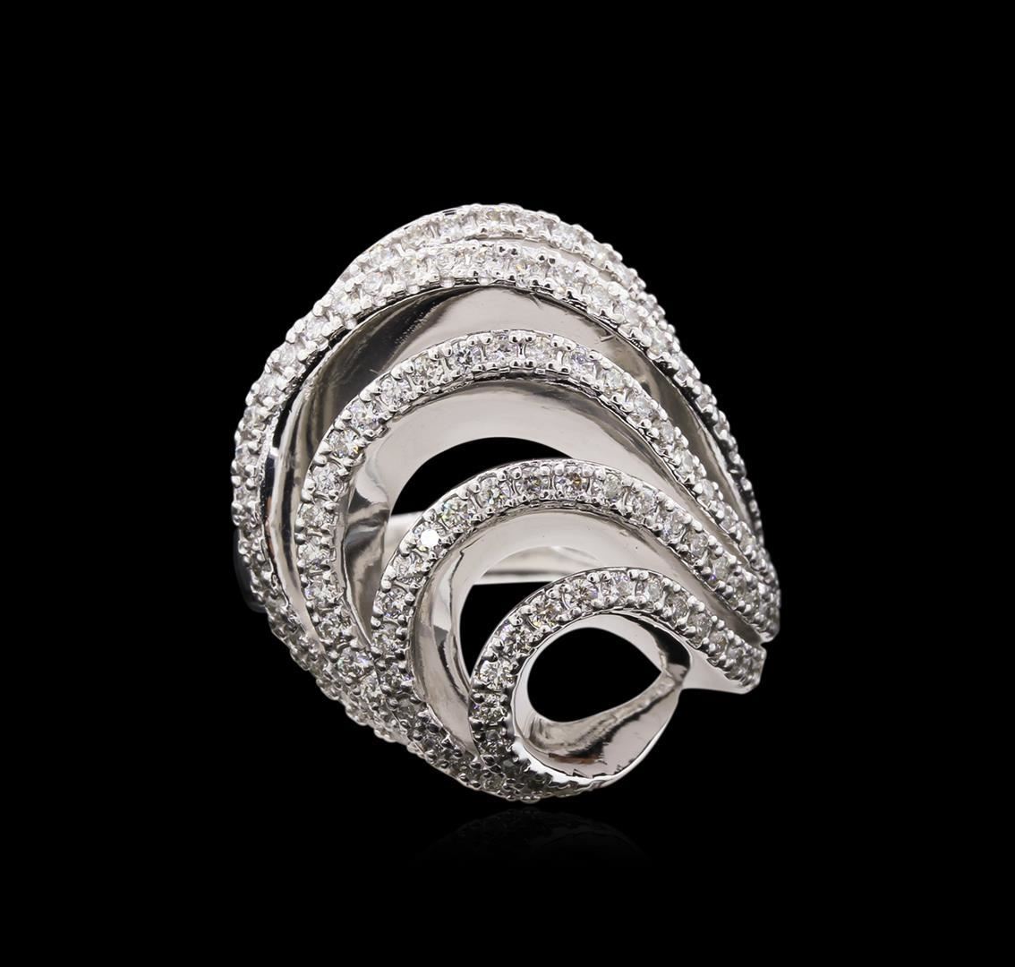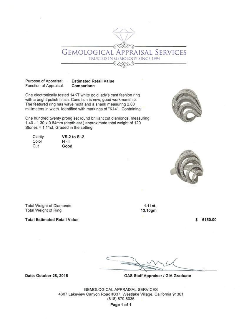 One electronically tested 14KT white gold lady's cast fashion ring with a bright polish finish. The featured ring has wave motif and a shank measuring 2.80 millimeters in width. Identified with markings of "K14". Condition is new, good workmanship. Containing: One Hundred Twenty prong set round brilliant cut diamonds, measuring 1.40 - 1.30 x 0.84mm (depth est.) approximate total weight of 120 Stones = 1.11ct. Graded in the setting. Clarity: VS-2 to SI-2. Color: H - I. Cut Good. Total Weight of Diamonds 1.11ct. Total Weight of Ring 13.10gm. GAS Appraised.