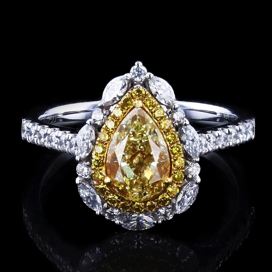 1.11ct Fancy Light Yellow CENTER Diamond 18K White and Yellow Gold Ring (1.46ctw Diamonds). Eighteen karat (18K) two tone gold natural fancy color and colorless diamond ring. A natural fancy light yellow pear brilliant cut diamond is mounted in the center of the ring. Colorless and natural fancy yellow round brilliant and marquise cut diamonds accent the ring around and on both sides of the center diamond. The ring has a gross weight of 5.3 Grams. NATURAL DIAMOND 1) CENTER DIAMOND SHAPE: Pear Modified Brilliant Cut QUANTITY: 1, Mounted Total WEIGHT: 1.11 carat total DIMENSIONS: 8.06 x 5.25 x 3.52mm GIRDLE: Slightly Thick-Extremely Thick, Faceted CULET: None CLARITY: SI2 COLOR: Natural, Fancy Light Yellow, Even CUT: Excellent SYMMETRY: Excellent POLISH: Excellent FLUORESCENCE: Medium Blue 2) DIAMOND SETTING SHAPE: Round Brilliant and Marquise Brilliant Cut WEIGHT: 0.35 carat total (Colorless-26pcs. Fancy Yellow-22pcs.) DIMENSIONS: 3.5 x 1.0mm AVERAGE CLARITY: VS2 to SI1 AVERAGE COLOR: F - G (Colorless) Natural, Fancy Yellow, Even SYMMETRY: Excellent POLISH: Excellent METAL: Gold PURITY: 18K (750) COLOR: Two Tone CONDITION: Excellent FINISH: High Polish