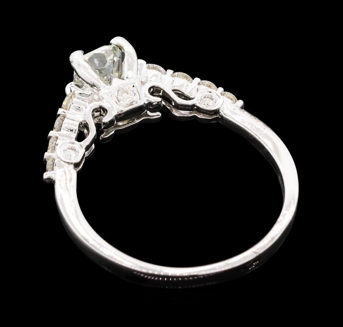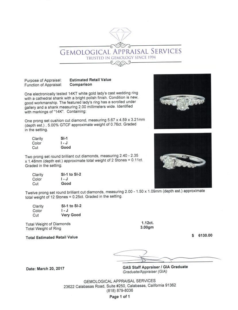 One electronically tested 14KT white gold lady's cast wedding ring with a cathedral shank with a bright polish finish. The featured lady's ring has a scrolled under gallery and a shank measuring 2.00 millimeters wide. Identified with markings of '14K'. Condition is new, good workmanship. Containing: One prong set cushion cut diamond, measuring 5.67 x 4.59 x 3.21mm (depth est.) , 5.00.%. GTCF approximate weight of 0.76ct. Graded in the setting. Color I - J Clarity SI-1 Cut Good Two prong set round brilliant cut diamonds, measuring 2.40 - 2.35 x 1.48mm (depth est.) approximate total weight of 2 Stones = 0.11ct. Graded in the setting. Color I - J Clarity SI-1 to SI-2 Cut Good Twelve prong set round brilliant cut diamonds, measuring 2.00 - 1.50 x 1.09mm (depth est.) approximate total weight of 12 Stones = 0.25ct. Graded in the setting. Color I - J Clarity SI-1 to SI-2 Cut Very Good. Total Weight of Diamonds 1.12ct.. Total Weight of Ring 3.00gm GAS Appraised.