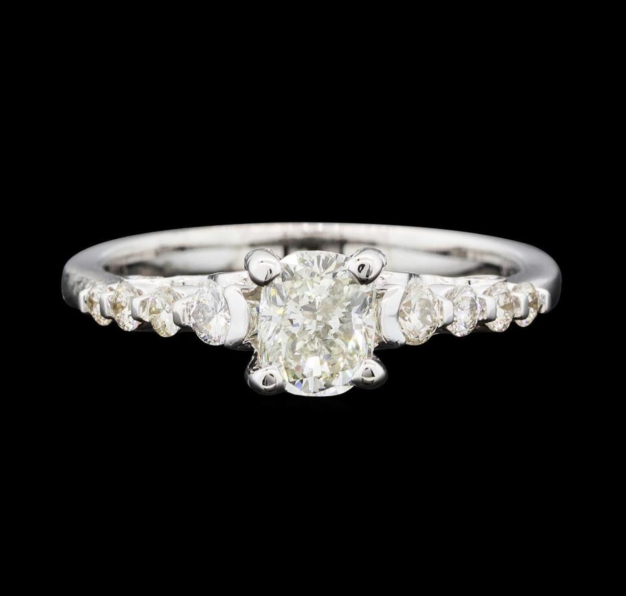 One electronically tested 14KT white gold lady's cast wedding ring with a cathedral shank with a bright polish finish. The featured lady's ring has a scrolled under gallery and a shank measuring 2.00 millimeters wide. Identified with markings of '14K'. Condition is new, good workmanship. Containing: One prong set cushion cut diamond, measuring 5.67 x 4.59 x 3.21mm (depth est.) , 5.00.%. GTCF approximate weight of 0.76ct. Graded in the setting. Color I - J Clarity SI-1 Cut Good Two prong set round brilliant cut diamonds, measuring 2.40 - 2.35 x 1.48mm (depth est.) approximate total weight of 2 Stones = 0.11ct. Graded in the setting. Color I - J Clarity SI-1 to SI-2 Cut Good Twelve prong set round brilliant cut diamonds, measuring 2.00 - 1.50 x 1.09mm (depth est.) approximate total weight of 12 Stones = 0.25ct. Graded in the setting. Color I - J Clarity SI-1 to SI-2 Cut Very Good. Total Weight of Diamonds 1.12ct.. Total Weight of Ring 3.00gm GAS Appraised.