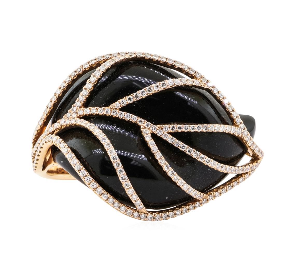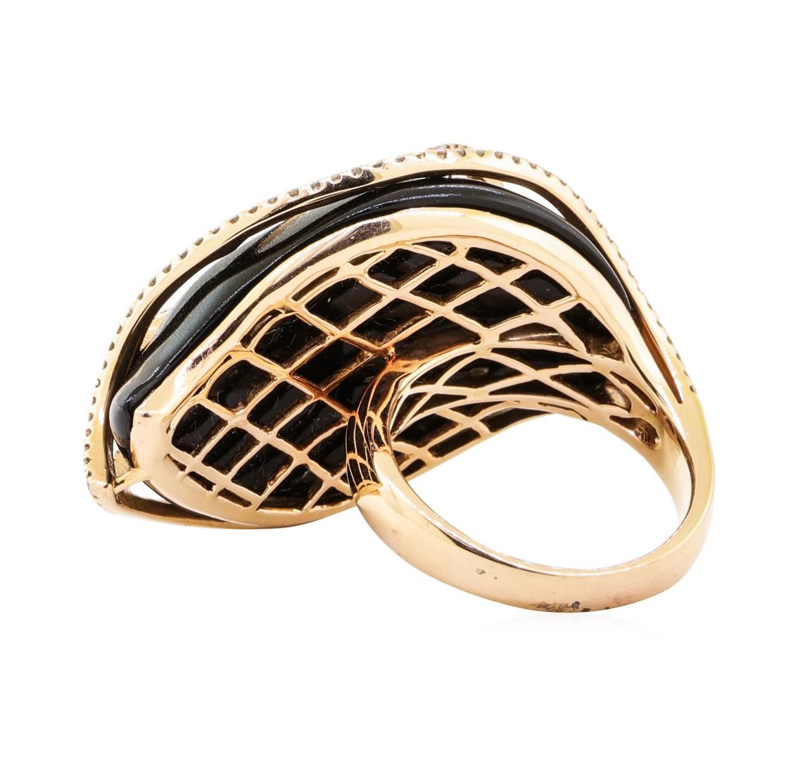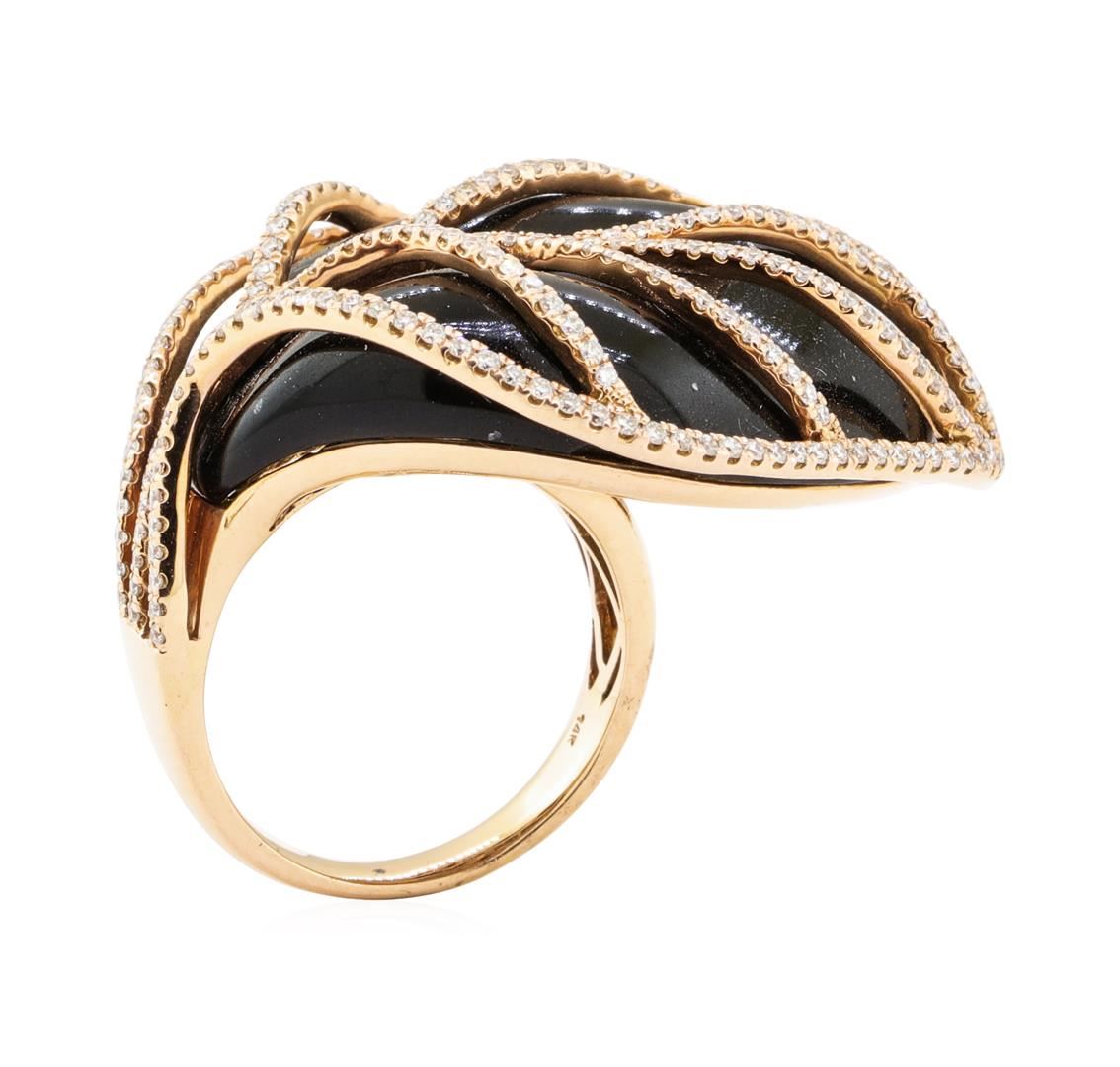 One electronically tested 14KT rose gold lady's combination cast & assembled fashion ring with a leaf motif with a bright polish finish. The featured lady's ring has a hand-carved piece of black coral in the shape of a domed leaf, and a shank measuring 3.20 millimeters wide. Identified with markings of '14K'. Condition is new, good workmanship. Containing: Two Hundred Thirteen prong set round brilliant cut diamonds, measuring 1.15 - 1.10 x 0.68mm (depth est.) approximate total weight of 213 Stones = 1.12ct. Graded in the setting. Color G - H Clarity VS-1 to VS-2 Cut Very Good. Total Weight of Diamonds 1.12ct.. Total Weight of Ring 17.50gm GAS Appraised at $6775.00. GAS Appraised.