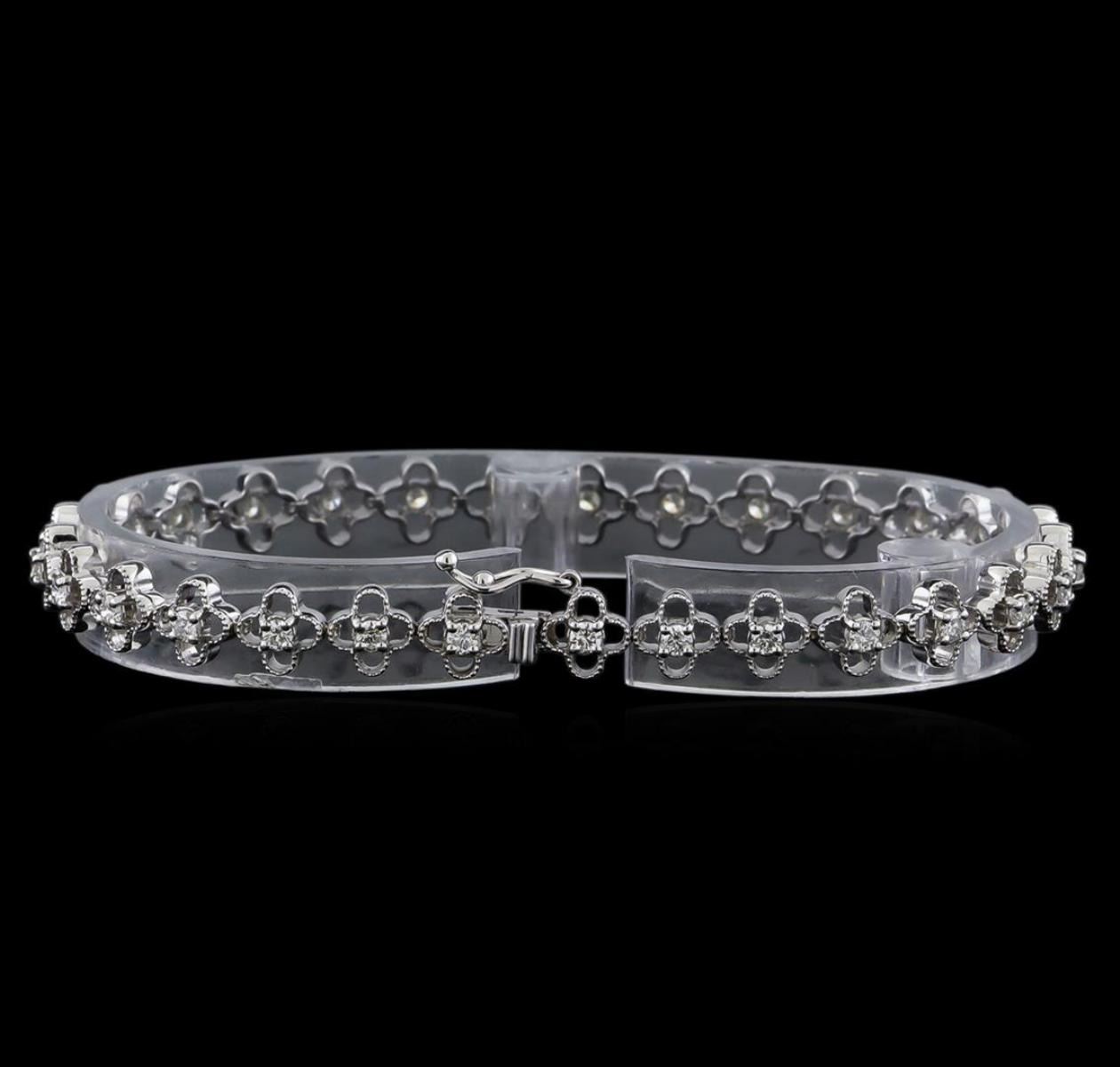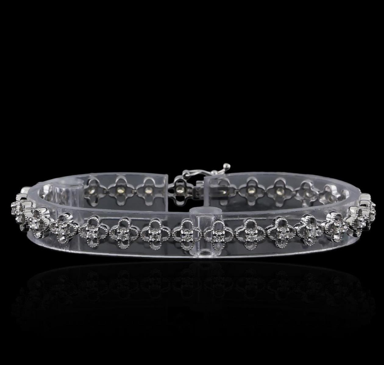 One electronically tested 14KT white gold ladies cast & assembled diamond bracelet. Seven and one-quarter inch length bracelet features a flexible ribbon of diamond floral links, terminating in a concealed clasp with safety. Bright polish finish with milgrain detailing. Identified with markings of "K14". Condition is new, good workmanship. Containing: Twenty-Nine prong set round brilliant cut diamonds, measuring 2.20 - 2.20 x 1.32mm exact total weight 29 Stones = 1.13ct. Graded in the setting. Clarity: SI-2 to I-1. Color: F - H. Total Weight of Diamonds 1.13ct. Total Weight of Bracelet 9.43gm. AIG Appraised.