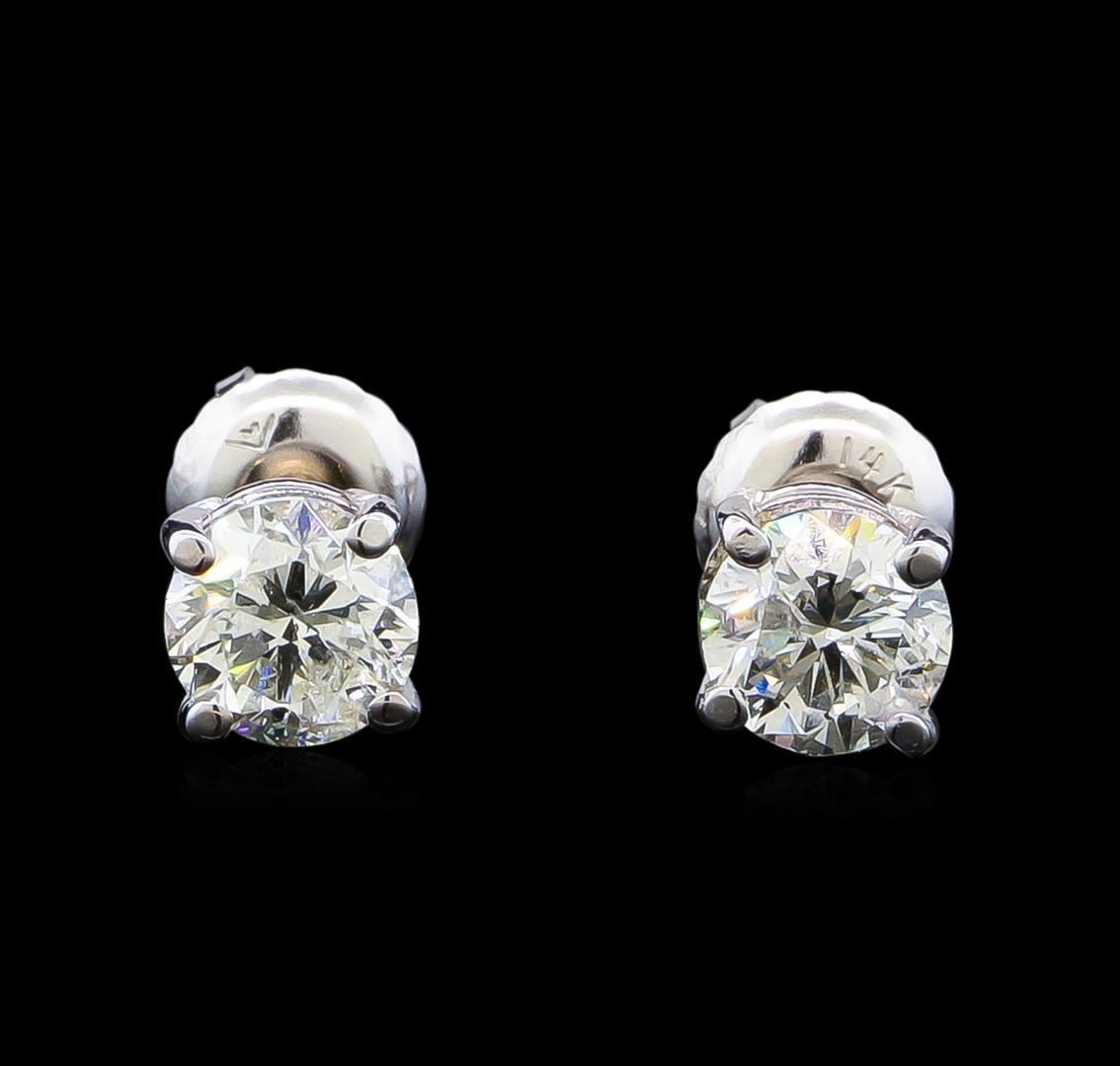 One pair electronically tested 14KT white gold lady's combination cast & assembled diamond stud earrings with threaded posts and screw-on/screw-off backs with a basket setting with a bright polish finish. Identified with markings of "14K". Condition is new, good workmanship. Containing: One prong set round brilliant cut diamond, measuring 5.14 - 5.12 x 3.54mm (depth est.) approximate weight of 0.58ct. Graded in the setting. Clarity: SI-2. Color: H. Cut Good One prong set round brilliant cut diamond, measuring 5.06 - 5.03 x 3.43mm (depth est.) , 3.00.%. GTCF approximate weight of 0.55ct. Graded in the setting. Clarity: I-1. Color: Good. Total Weight of Diamonds 1.13ct. Total Weight of Stud Earrings 1.20gm. GAS Appraised.