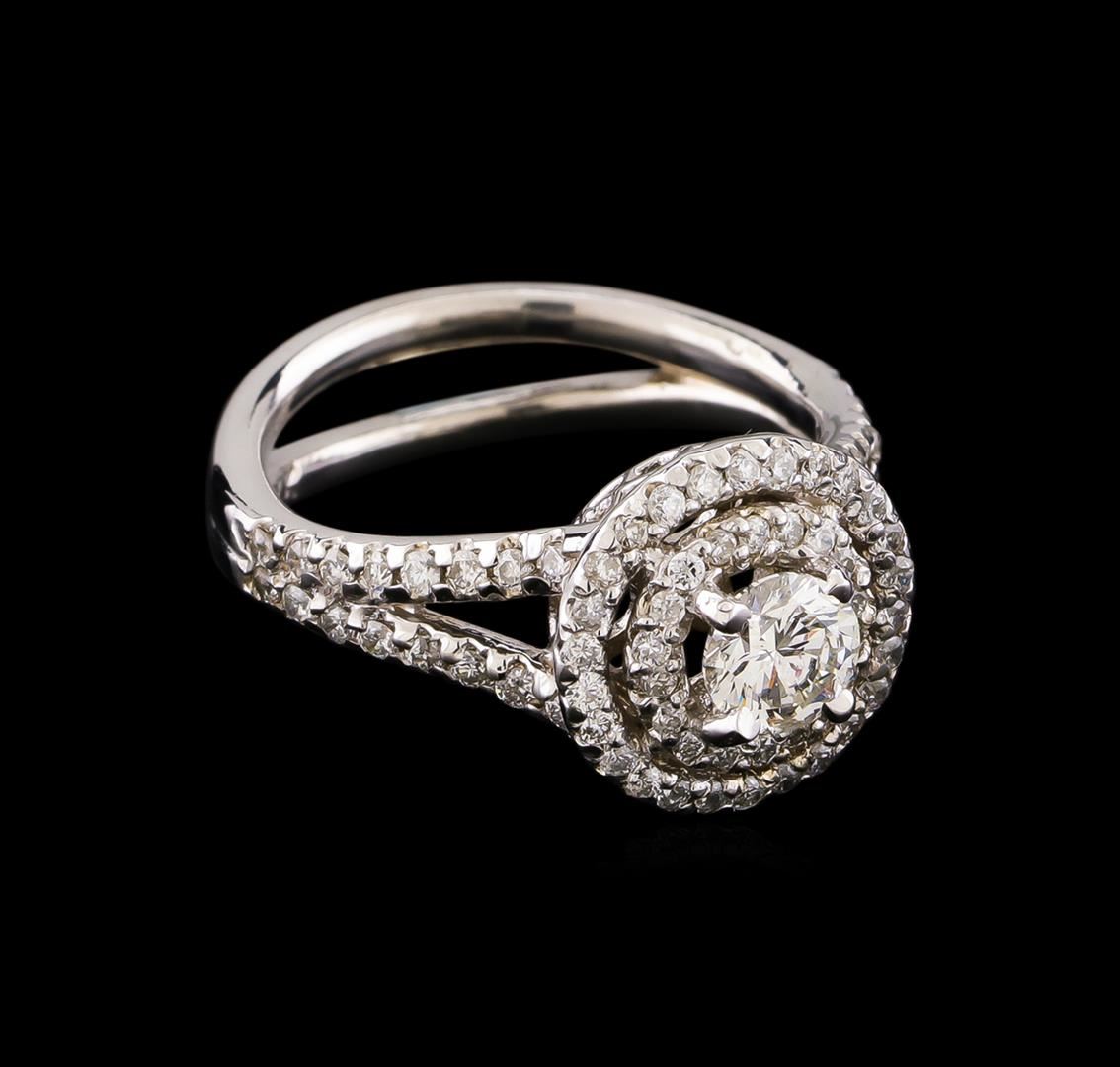 One electronically tested 14KT white gold lady's cast wedding ring with a split shank double basket halo with a bright polish finish. The featured lady's ring has a double shank measuring 3.20 millimeters wide. Identified with markings of "14K". Condition is new, good workmanship. Containing: One prong set round brilliant cut diamond, measuring 5.05 - 5.02 x 3.28mm (depth est.) approximate weight of 0.51ct. Graded in the setting. Clarity: SI-2. Color: Good Thirty-Two prong set round brilliant cut diamonds, measuring 1.40 - 1.30 x 0.84mm (depth est.) approximate total weight of 32 Stones = 0.30ct. Graded in the setting. Clarity: SI-1 to SI-2. Color: G - Good Forty-Four prong set round brilliant cut diamonds, measuring 1.30 - 1.20 x 0.78mm (depth est.) approximate total weight of 44 Stones = 0.33ct. Graded in the setting. Clarity: SI-1 to SI-2. Color: H - I. Cut Good. Total Weight of Diamonds 1.14ct. Total Weight of Ring 5.60gm. GAS Appraised at $6,220.00.