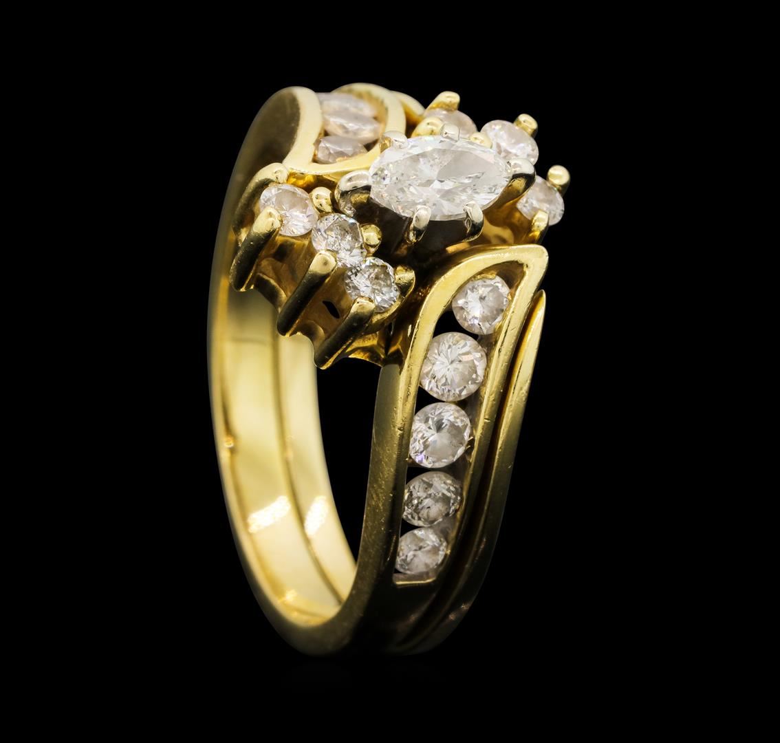 One set electronically tested 14KT yellow gold lady's cast wedding ring & wedding band with a bright polish finish. The featured lady's ring and band have a double shank measuring 3.98 millimeters wide. Identified with markings of '14K'. Condition is used, good workmanship. Containing: One prong set marquise shaped cut diamond, measuring 5.70 x 3.35 x 2.11mm (depth est.) approximate weight of 0.24ct. Graded in the setting. Color G Clarity VS-2 Cut Very Good Sixteen channel and prong set round brilliant cut diamonds, measuring 2.60 - 2.40 x 1.55mm (depth est.) approximate total weight of 16 Stones = 0.90ct. Graded in the setting. Color H - I Clarity SI-1 to SI-2 Cut Good. Total Weight of Diamonds 1.14ct.. Total Weight of Ring & Wedding Band 7.00gm GAS Appraised.