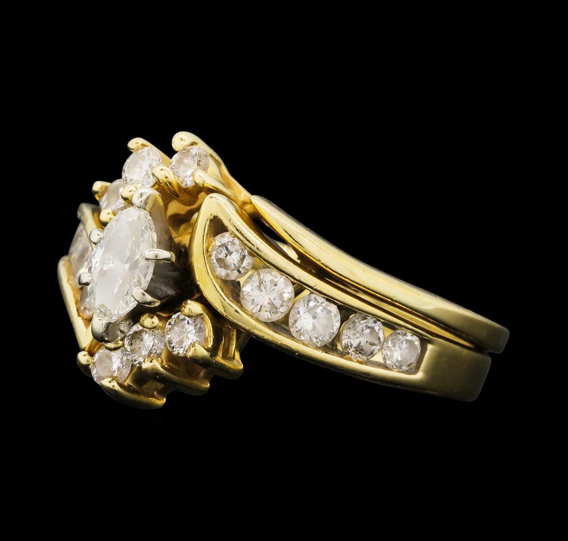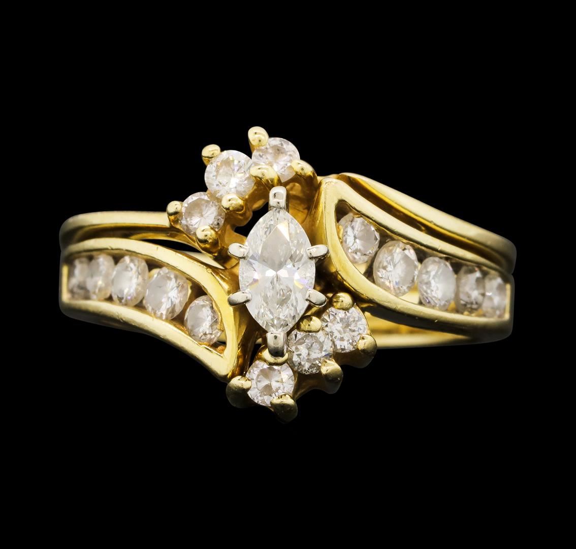 One set electronically tested 14KT yellow gold lady's cast wedding ring & wedding band with a bright polish finish. The featured lady's ring and band have a double shank measuring 3.98 millimeters wide. Identified with markings of '14K'. Condition is used, good workmanship. Containing: One prong set marquise shaped cut diamond, measuring 5.70 x 3.35 x 2.11mm (depth est.) approximate weight of 0.24ct. Graded in the setting. Color G Clarity VS-2 Cut Very Good Sixteen channel and prong set round brilliant cut diamonds, measuring 2.60 - 2.40 x 1.55mm (depth est.) approximate total weight of 16 Stones = 0.90ct. Graded in the setting. Color H - I Clarity SI-1 to SI-2 Cut Good. Total Weight of Diamonds 1.14ct.. Total Weight of Ring & Wedding Band 7.00gm GAS Appraised.