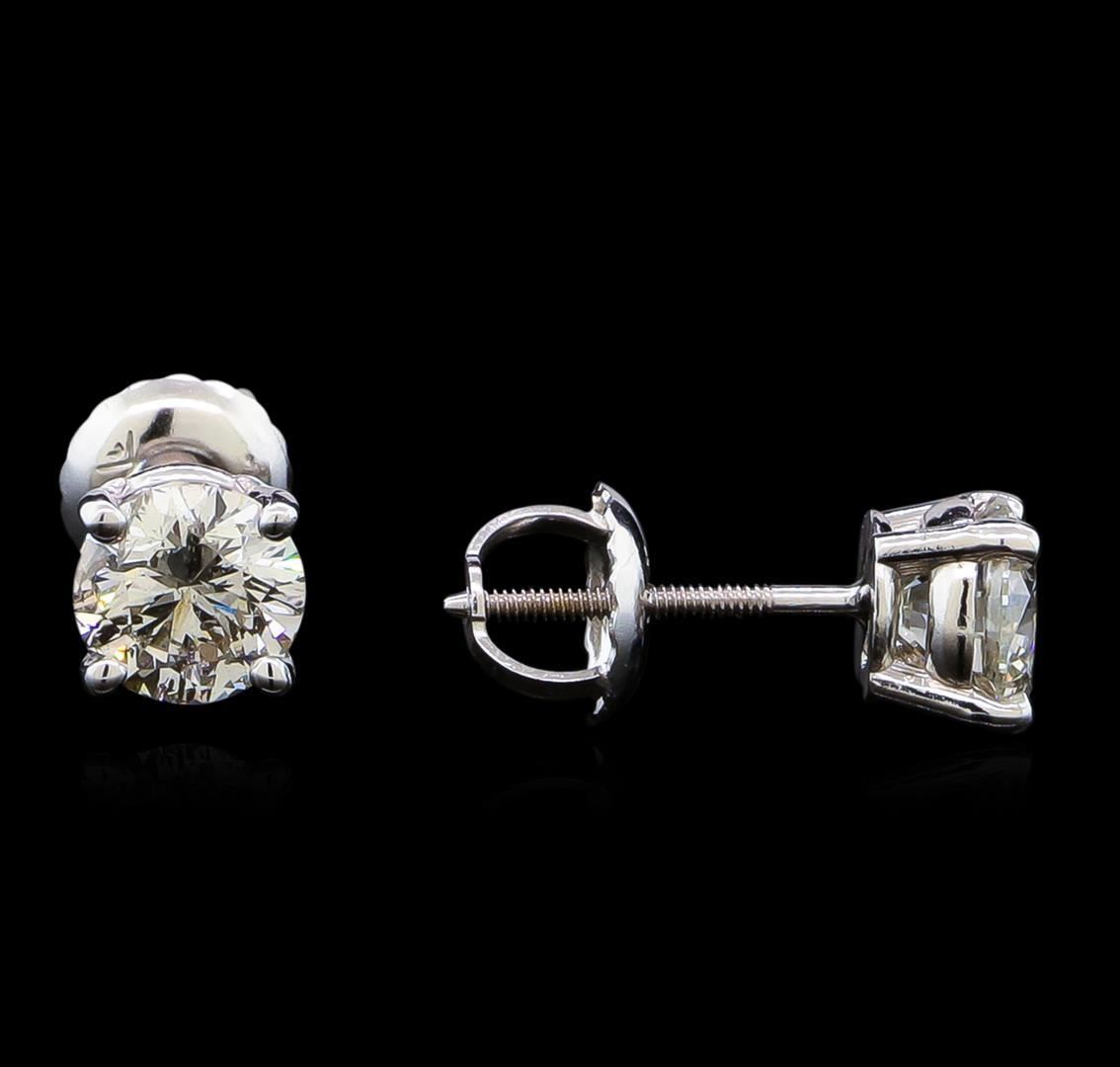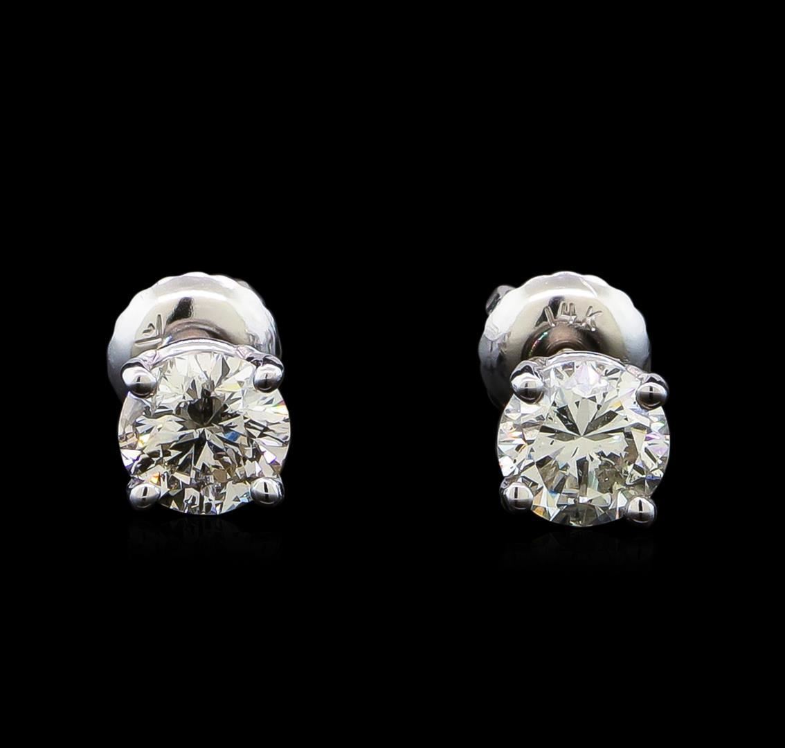 One pair electronically tested 14KT white gold lady's combination cast & assembled diamond stud earrings with threaded posts and screw-on/screw-off backs with a basket setting with a bright polish finish. Identified with markings of "14K". Condition is new, good workmanship. Containing: One prong set round brilliant cut diamond, measuring 5.26 - 5.24 x 3.36mm (depth est.) approximate weight of 0.58ct. Graded in the setting. Clarity: SI-1. Color: Good One prong set round brilliant cut diamond, measuring 5.29 - 5.25 x 3.32mm (depth est.) approximate weight of 0.56ct. Graded in the setting. Clarity: SI-2. Color: Very Good. Total Weight of Diamonds 1.14ct. Total Weight of Stud Earrings 1.20gm. GAS Appraised.