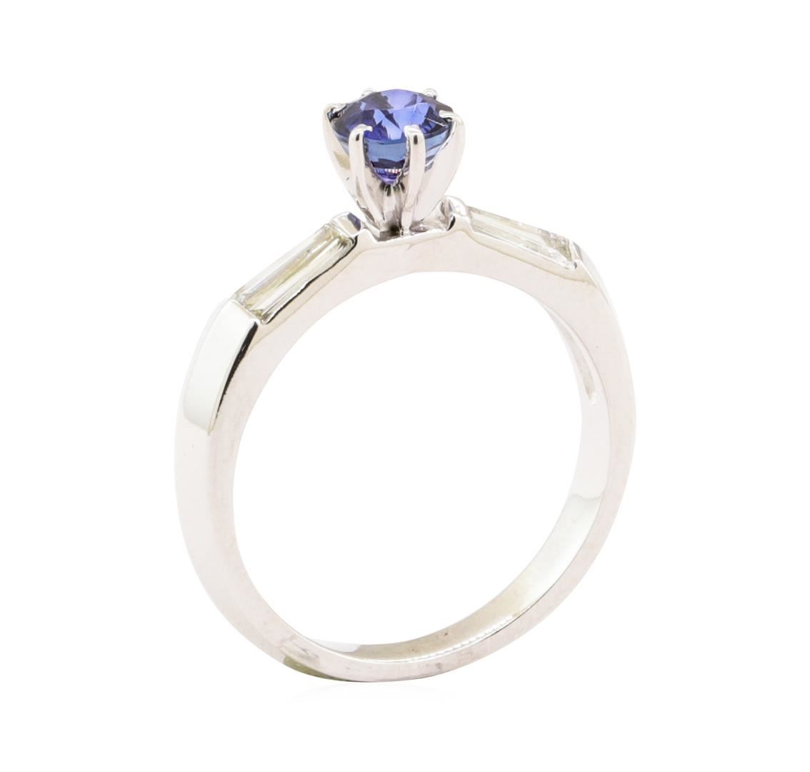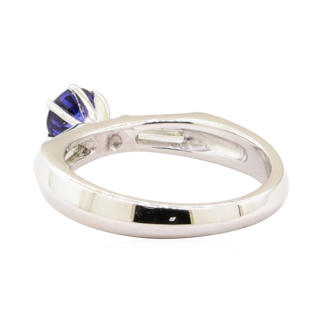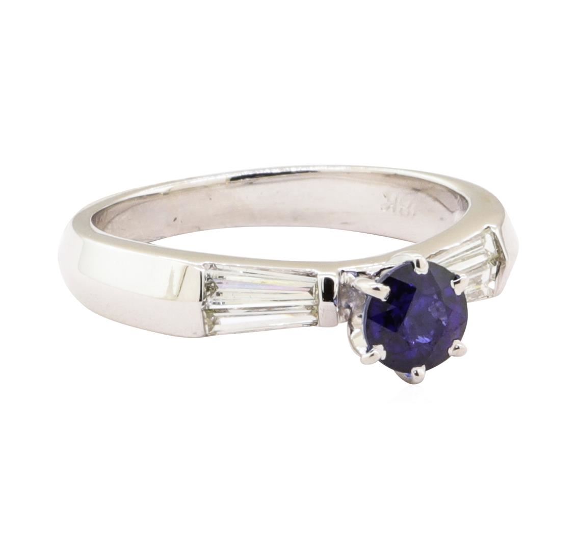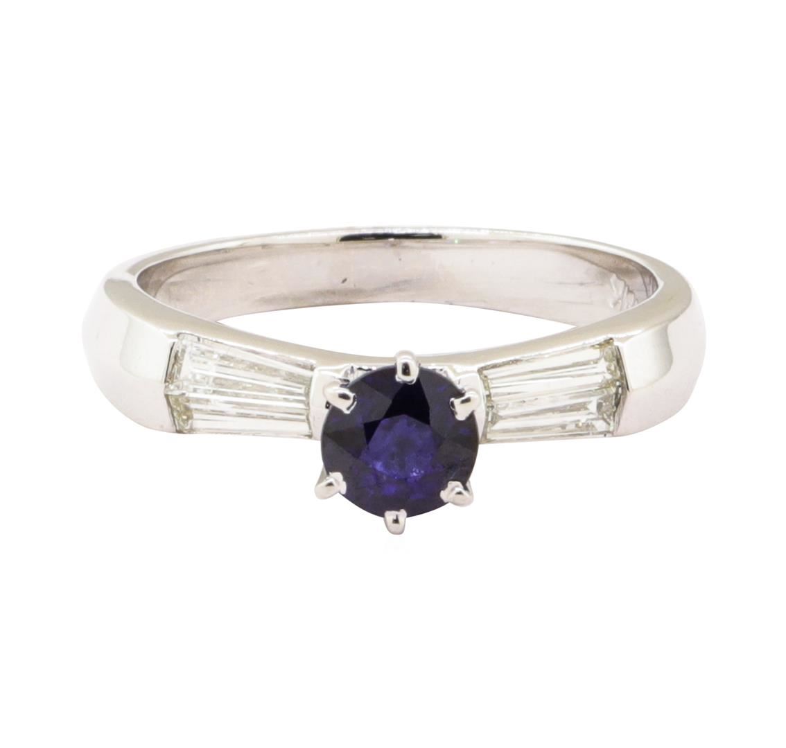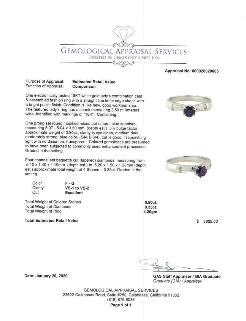One electronically tested 18KT white gold lady's combination cast & assembled fashion ring with a straight line knife edge shank with a bright polish finish. The featured lady's ring has a shank measuring 2.50 millimeters wide. Identified with markings of '18K'. Condition is like new, good workmanship. Containing: One prong set round modified mixed cut natural blue sapphire, measuring 5.07 - 5.04 x 3.50 mm, (depth est.) 5%. bulge factor, approximate weight of 0.80ct., clarity is eye clean, medium dark, moderately strong, blue color, (GIA B 6/4), cut is good. Transmitting light with no distortion, transparent. Colored gemstones are presumed to have been subjected to commonly used enhancement processes. Graded in the setting. Four channel set baguette cut (tapered) diamonds, measuring from 5.10 x 1.40 x 1.19mm (depth est.) to 5.20 x 1.50 x 1.28mm (depth est.) approximate total weight of 4 Stones = 0.35ct. Graded in the setting. Color F - G Clarity VS-1 to VS-2 Cut Excellent. Total Weight of Colored Stones 0.80ct.. Total Weight of Diamonds 0.35ct.. Total Weight of Ring 4.20gm GAS Appraised at $3825.00. GAS Appraised.