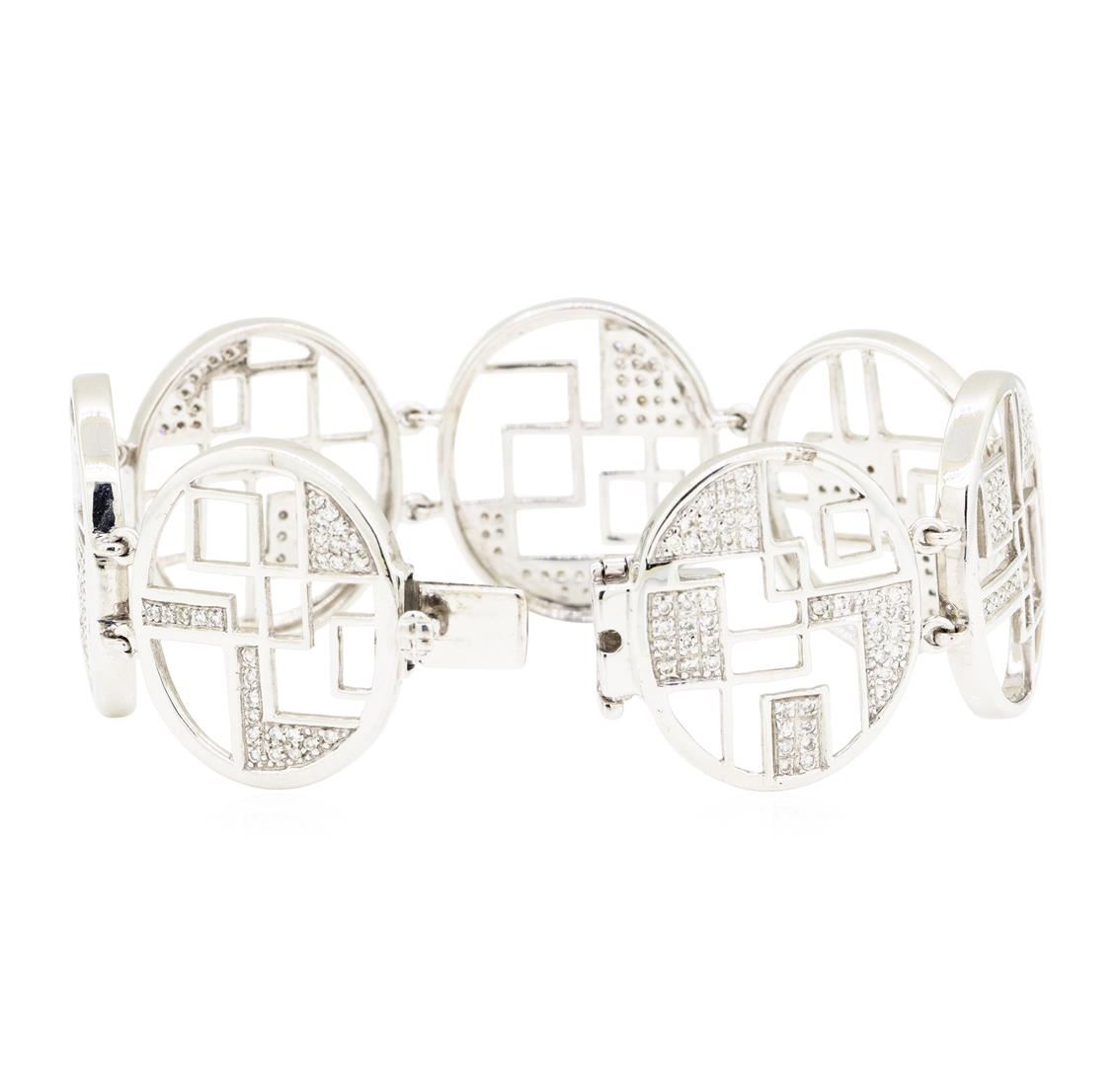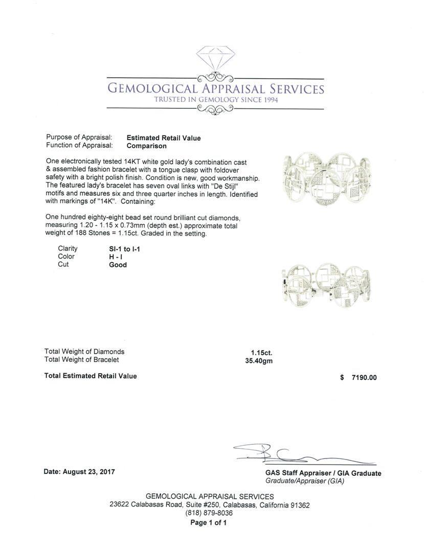 One electronically tested 14KT white gold lady's combination cast & assembled fashion bracelet with a tongue clasp with foldover safety with a bright polish finish. The featured lady's bracelet has seven oval links with 'De Stijl' motifs and measures six and three quarter inches in length. Identified with markings of '14K'. Condition is new, good workmanship. Containing: One Hundred Eighty-Eight bead set round brilliant cut diamonds, measuring 1.20 - 1.15 x 0.73mm (depth est.) approximate total weight of 188 Stones = 1.15ct. Graded in the setting. Color H - I Clarity SI-1 to I-1 Cut Good. Total Weight of Diamonds 1.15ct.. Total Weight of Bracelet 35.40gm GAS Appraised at $7190.00. GAS Appraised.