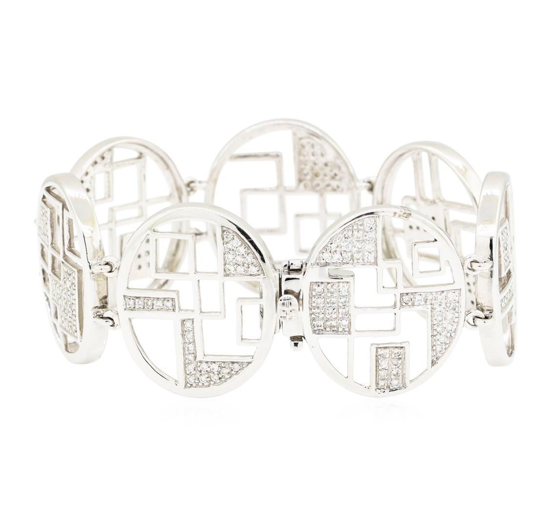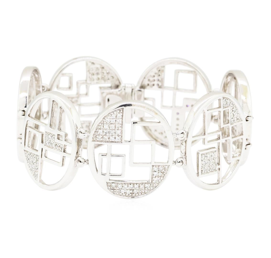 One electronically tested 14KT white gold lady's combination cast & assembled fashion bracelet with a tongue clasp with foldover safety with a bright polish finish. The featured lady's bracelet has seven oval links with 'De Stijl' motifs and measures six and three quarter inches in length. Identified with markings of '14K'. Condition is new, good workmanship. Containing: One Hundred Eighty-Eight bead set round brilliant cut diamonds, measuring 1.20 - 1.15 x 0.73mm (depth est.) approximate total weight of 188 Stones = 1.15ct. Graded in the setting. Color H - I Clarity SI-1 to I-1 Cut Good. Total Weight of Diamonds 1.15ct.. Total Weight of Bracelet 35.40gm GAS Appraised at $7190.00. GAS Appraised.