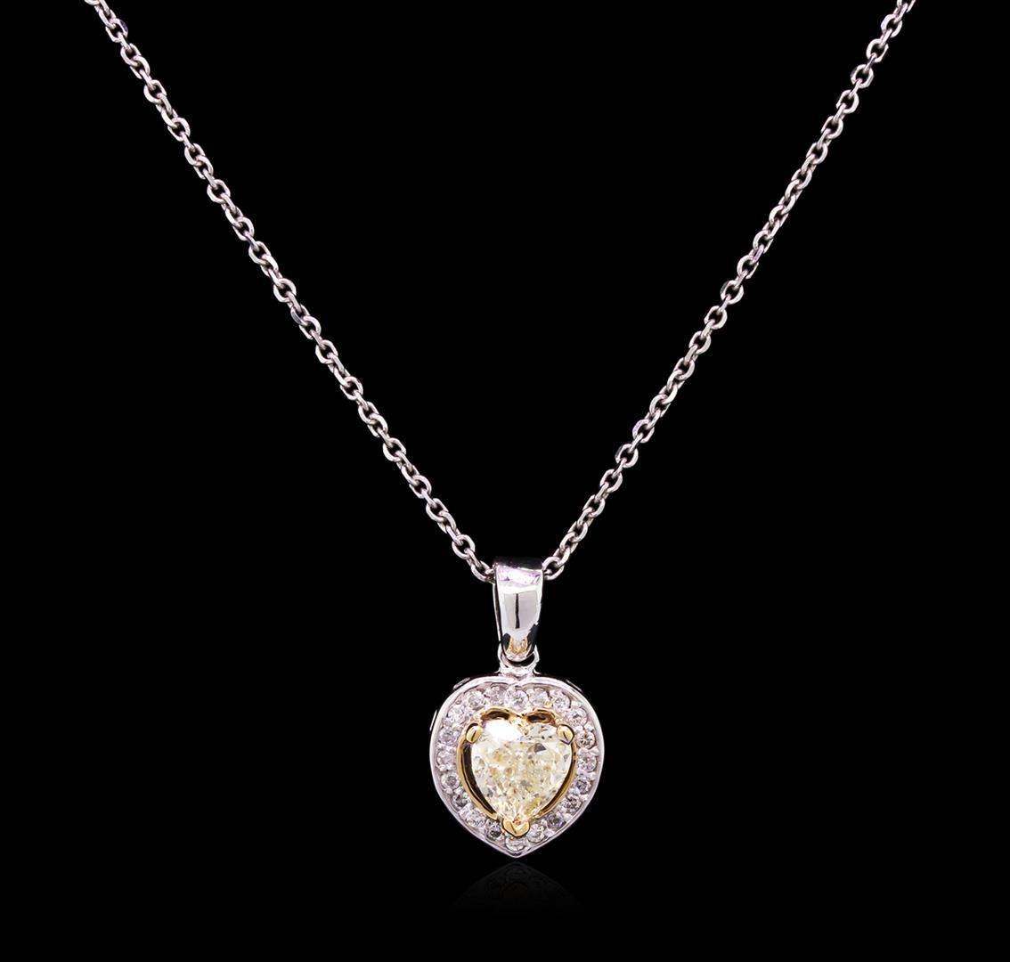 One electronically tested 14KT white gold ladies cast & assembled diamond pendant and chain. The pendant features a heart shaped diamond set within a diamond bezel, completed by a white gold bail. The pendant is supported by an eighteen inch length 14KT white gold designer style chain, terminating in a lobster claw clasp. Bright polish finish with yellow gold accents. Identified with markings of "14K". Condition is new, good workmanship. Containing: One prong set heart shaped cut diamond, measuring 6.50 x 6.00 x 3.78mm, 15.00% GTCF exact weight 1.00ct with a strong blue fluorescence. Graded in the setting. Clarity: SI-2. Depth: 63.0%. Table 58.3%. Twenty prong set round brilliant cut diamonds, measuring 1.30 - 1.30 x 0.78mm exact total weight 20 Stones = 0.15ct. Graded in the setting. Clarity: SI-2 to I-1. Color: G - I. Total Weight of Diamonds 1.15ct. Total Weight of Pendant And Chain 4.53gm. AIG Appraised.