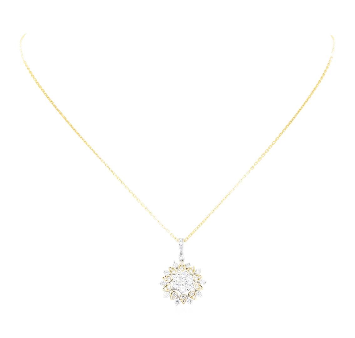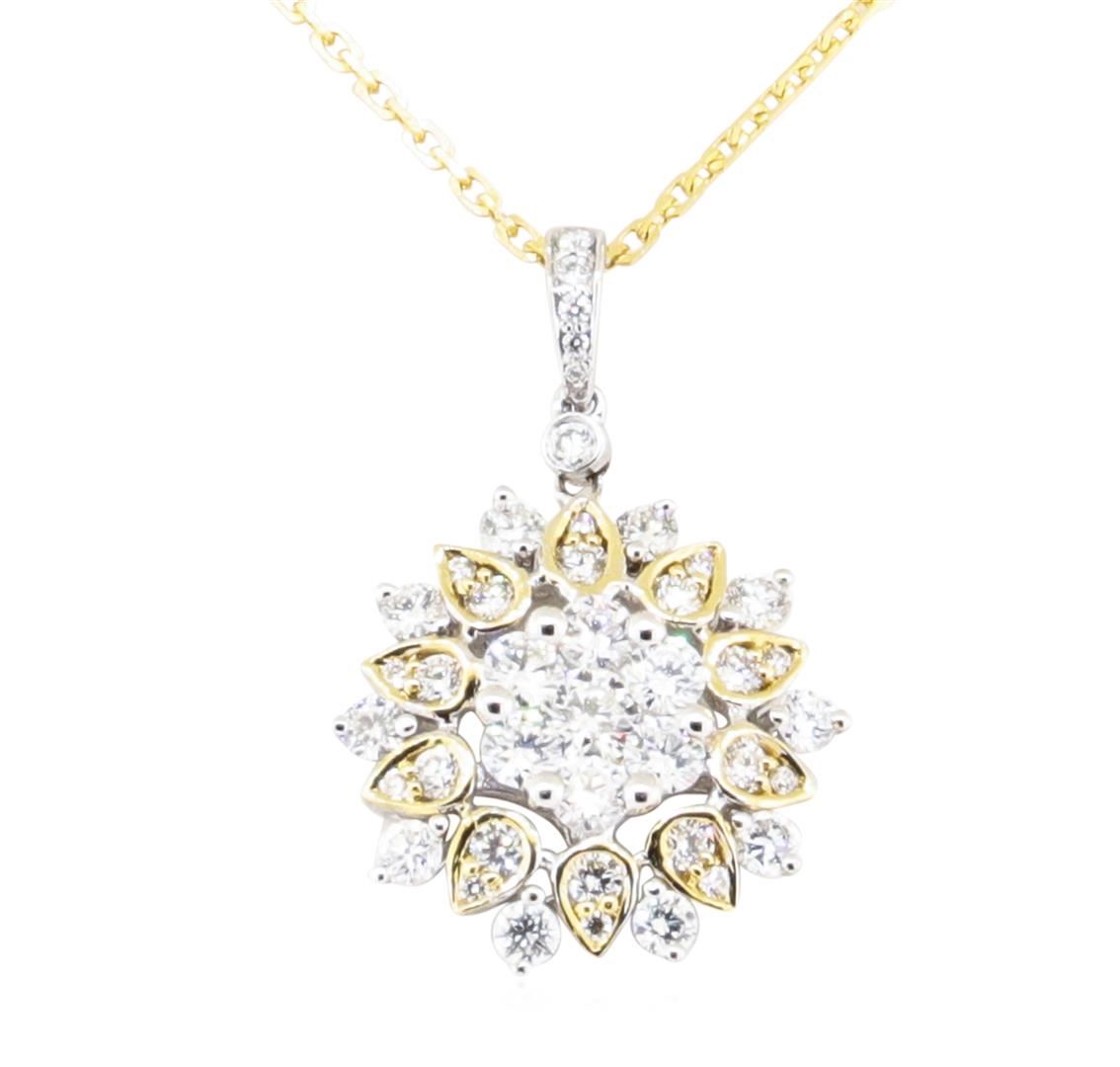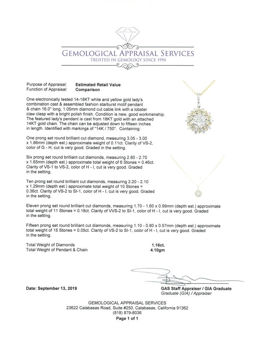 One electronically tested 14-18KT white and yellow gold lady's combination cast & assembled fashion starburst motif pendant & chain 16.0' long, 1.05mm diamond cut cable link with a lobster claw clasp with a bright polish finish. The featured lady's pendant is cast from 18KT gold with an attached 14KT gold chain. The chain can be adjusted down to fifteen inches in length. Identified with markings of '14K / 750'. Condition is new, good workmanship. Containing: One prong set round brilliant cut diamond, measuring 3.05 - 3.00 x 1.86mm (depth est.) approximate weight of 0.11ct. Graded in the setting. Color G - H Clarity VS-2 Cut Very Good Six prong set round brilliant cut diamonds, measuring 2.80 - 2.70 x 1.65mm (depth est.) approximate total weight of 6 Stones = 0.46ct. Graded in the setting. Color H - I Clarity VS-1 to VS-2 Cut Very Good Ten prong set round brilliant cut diamonds, measuring 2.20 - 2.10 x 1.29mm (depth est.) approximate total weight of 10 Stones = 0.36ct. Graded in the setting. Color H - I Clarity VS-2 to SI-1 Cut Very Good Eleven prong set round brilliant cut diamonds, measuring 1.70 - 1.60 x 0.99mm (depth est.) approximate total weight of 11 Stones = 0.18ct. Graded in the setting. Color H - I Clarity VVS-2 to SI-1 Cut Very Good Fifteen prong set round brilliant cut diamonds, measuring 1.10 - 0.80 x 0.57mm (depth est.) approximate total weight of 15 Stones = 0.05ct. Graded in the setting. Color H - I Clarity VS-2 to SI-1 Cut Very Good. Total Weight of Diamonds 1.16ct.. Total Weight of Pendant & Chain 4.10gm GAS Appraised at $4125.00. GAS Appraised.